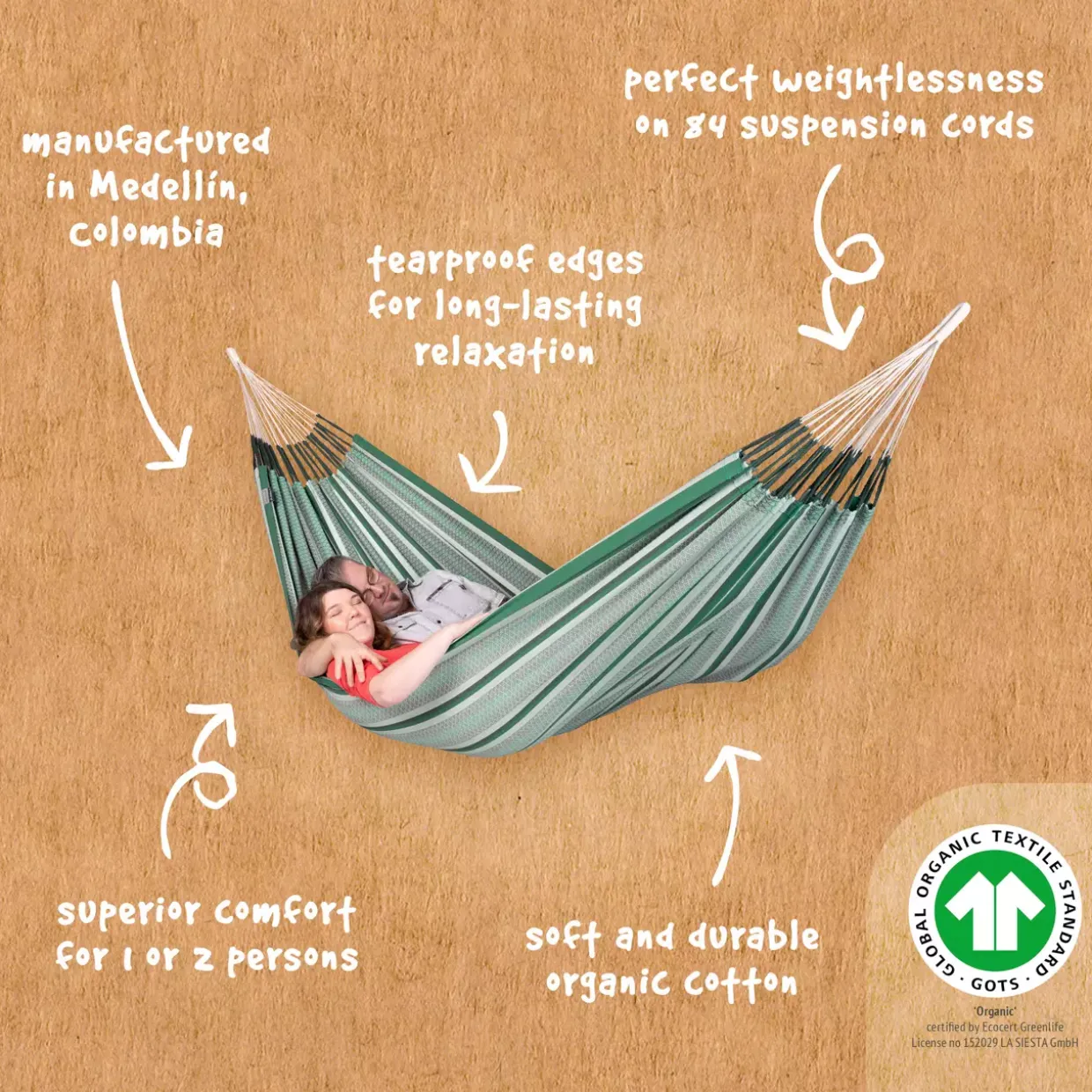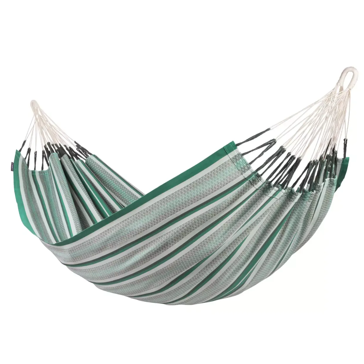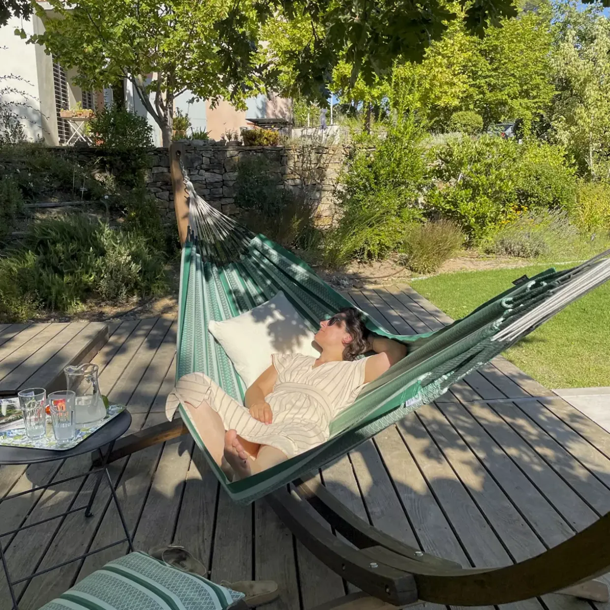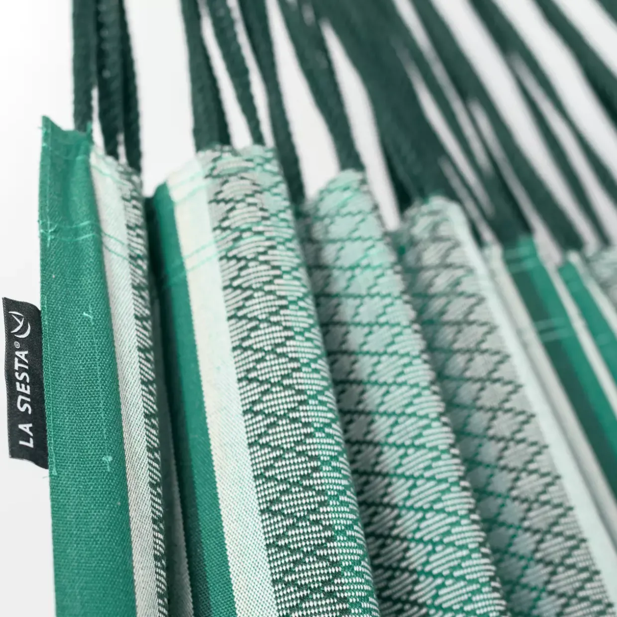 Modernes Design trifft auf die beruhigende Farbe Agave. Die Modesta Hängematte ist ein stilvolles Accessoire für Ihren Außenbereich, das gleichzeitig Komfort und Eleganz bietet. Gefertigt aus hochwertigem Textil, überzeugt die Hängematte durch die Verwendung von Baumwolle, die für ihre Weichheit und Beständigkeit bekannt ist. Diese Textilart sorgt für ein angenehmes Liegegefühl und ist zudem pflegeleicht.