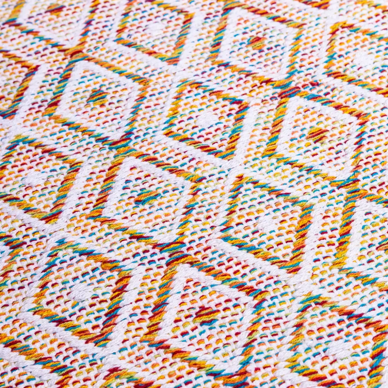Farbvielfalt trifft auf moderne Ästhetik im Modell Porto, einem exquisiten Handwebteppich. Die bunte Gestaltung verleiht jedem Raum eine lebendige und einladende Atmosphäre. Hergestellt aus hochwertigem Flachgewebe, kombiniert dieser Teppich die natürlichen Vorteile von Baumwolle mit der Langlebigkeit von Polyester.