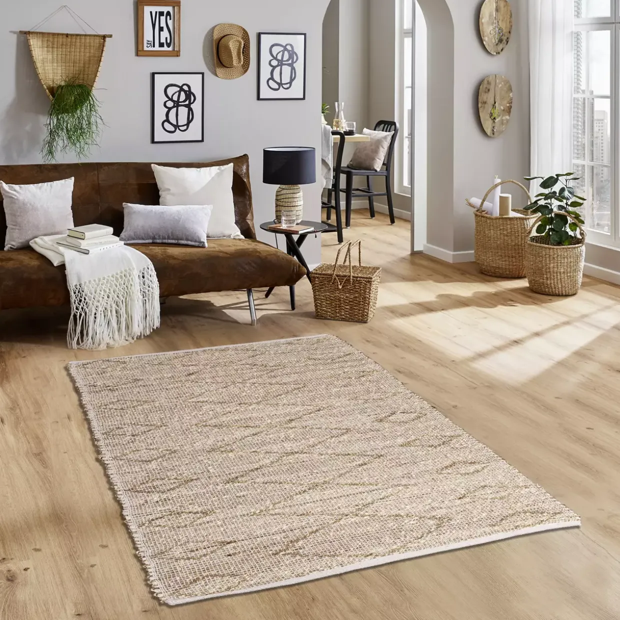 Ob im Wohnzimmer, Schlafzimmer oder Büro – dieser Teppich fügt sich harmonisch in verschiedenste Wohnkonzepte ein und setzt moderne Akzente. Lassen Sie sich von der schlichten Eleganz und dem natürlichen Charme des Handwebteppichs Modell Tahiti inspirieren. Entdecken Sie, wie ein einfaches Wohnaccessoire zum stilvollen Mittelpunkt Ihres Zuhauses werden kann.