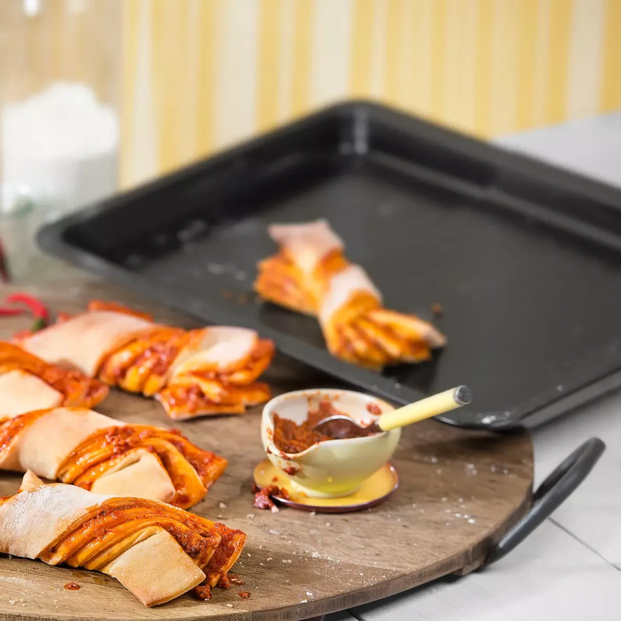 Für Liebhaber von Pizza und Crostini gibt es runde Varianten mit einem gelochten Thermoboden, während gewellte Thermoböden und Schüttränder ideal für Pommes sind. Die rechteckigen Herdbackbleche sind mit einer praktischen Schieberastung sowie ausziehbaren Rasterbügeln ausgestattet, die eine perfekte Passform in jedem Backofen garantieren.