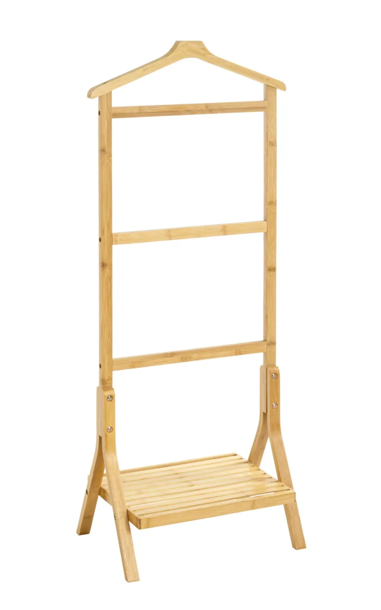 Ein 4-Fußgestell verleiht dem Herrendiener Stabilität und Standfestigkeit. Diese Konstruktion sorgt dafür, dass Ihre Kleidung ordentlich präsentiert wird, während der natürliche Charme von Bambus Ihrem Schlafzimmer oder Ankleideraum eine besondere Note verleiht.