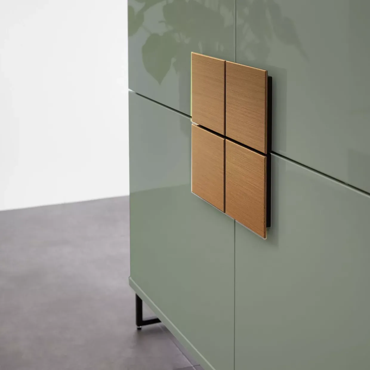 Eine vierteilige Griffplatte in Asteiche setzt raffinierte Akzente und unterstreicht die elegante Linienführung. Lackierte Oberflächen verleihen dem Highboard nicht nur eine edle Optik, sondern ermöglichen auch eine einfache Pflege und Reinigung. Die harmonische Farb- und Materialkombination fügt sich nahtlos in unterschiedliche Einrichtungsstile ein und wird zum Blickfang in jedem Raum.
