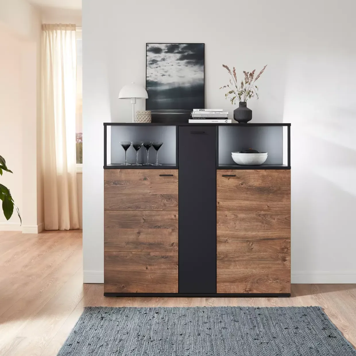 Eiche Ribbeck Cognac trifft auf modernes Design: Das Bacoor Highboard verbindet harmonisch die Eleganz des Japandi-Stils mit den klaren Linien zeitgenössischer Möbelkunst. Die Kombination aus hochwertigem Holzwerkstoff und der Cosmos Grey Melamin-Oberfläche sorgt für eine zeitlose Ästhetik, die sich nahtlos in verschiedene Wohnkonzepte einfügt. Die Türdämpfung ist ein besonderes Highlight und garantiert ein sanftes und geräuschloses Schließen der Türen, was nicht nur die Langlebigkeit des Möbels unterstützt, sondern auch den Komfort in Ihrem Zuhause erhöht.