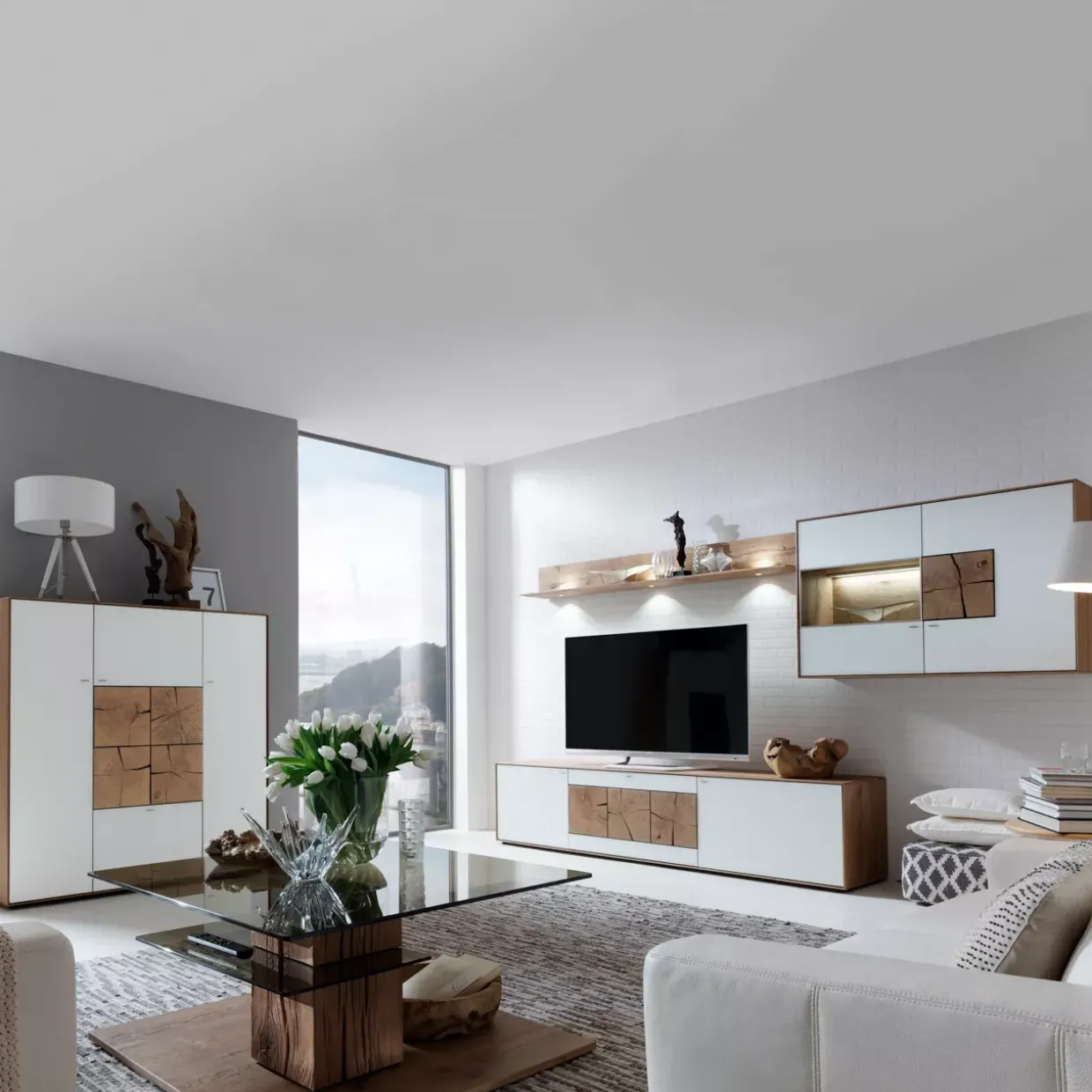 Mit fünf stabilen Holzböden bietet das Highboard reichlich Stauraum für Ihre persönlichen Schätze. Zwei zusätzliche Glaseinlegeböden setzen besondere Akzente und eröffnen Ihnen flexible Gestaltungsmöglichkeiten. Ob Sie Bücher, dekorative Objekte oder Geschirr stilvoll präsentieren möchten – die variablen Ablagemöglichkeiten passen sich Ihren individuellen Bedürfnissen an.