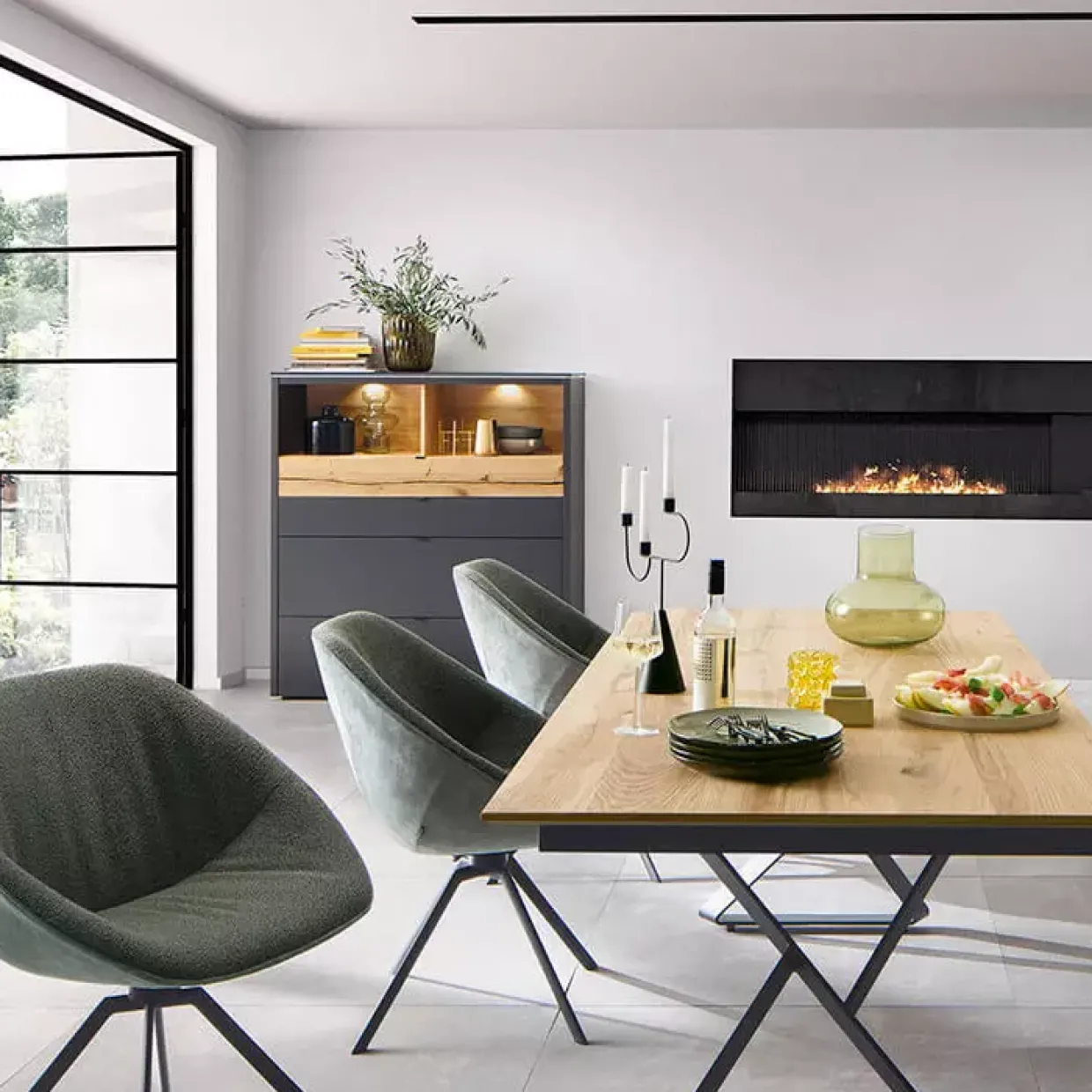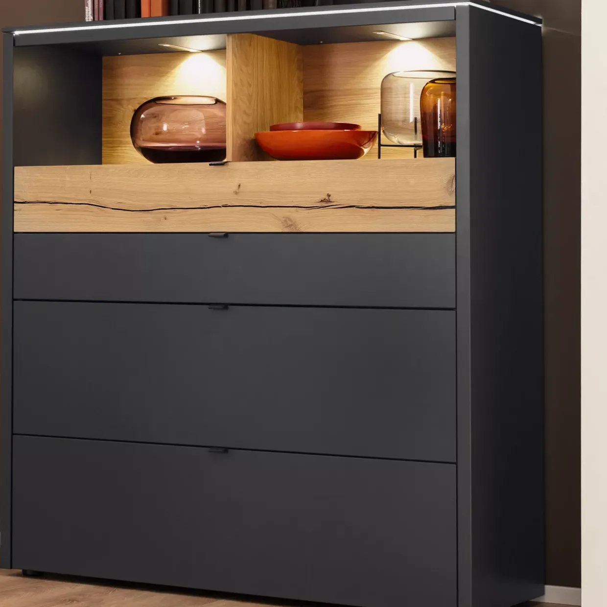 Hochwertige Beschläge mit Selbsteinzug und Dämpfung stehen im Mittelpunkt des modernen Highboards, das durch seine Kombination aus Holz und Metall besticht. Die gelungene Fusion dieser Materialien verleiht dem Möbelstück nicht nur Stabilität, sondern auch eine edle Optik. Die Farbe anthrazit matt ergänzt sich perfekt mit der Akzentfront in Balkeneiche, wodurch ein harmonisches Gesamtbild entsteht, das sowohl in klassische als auch in moderne Wohnräume passt.