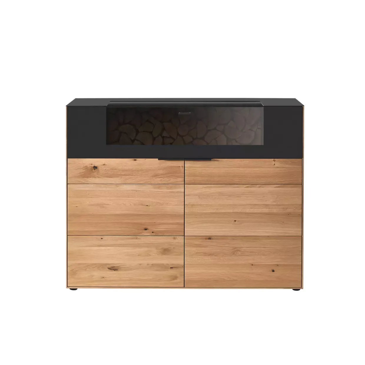 Die edle Wildeiche massiv soft gebürstet verleiht dem Highboard Varedo eine moderne und zeitlose Eleganz. Ansprechend kombiniert, treffen hier hochwertige Materialien wie Holz und Metall aufeinander und formen ein harmonisches Gesamtbild. Die charmanten Vitrinenausschnitte aus carbonfarbigem Massivholz und die strukturiert pulverbeschichteten Metallteile setzen stilvolle Akzente.