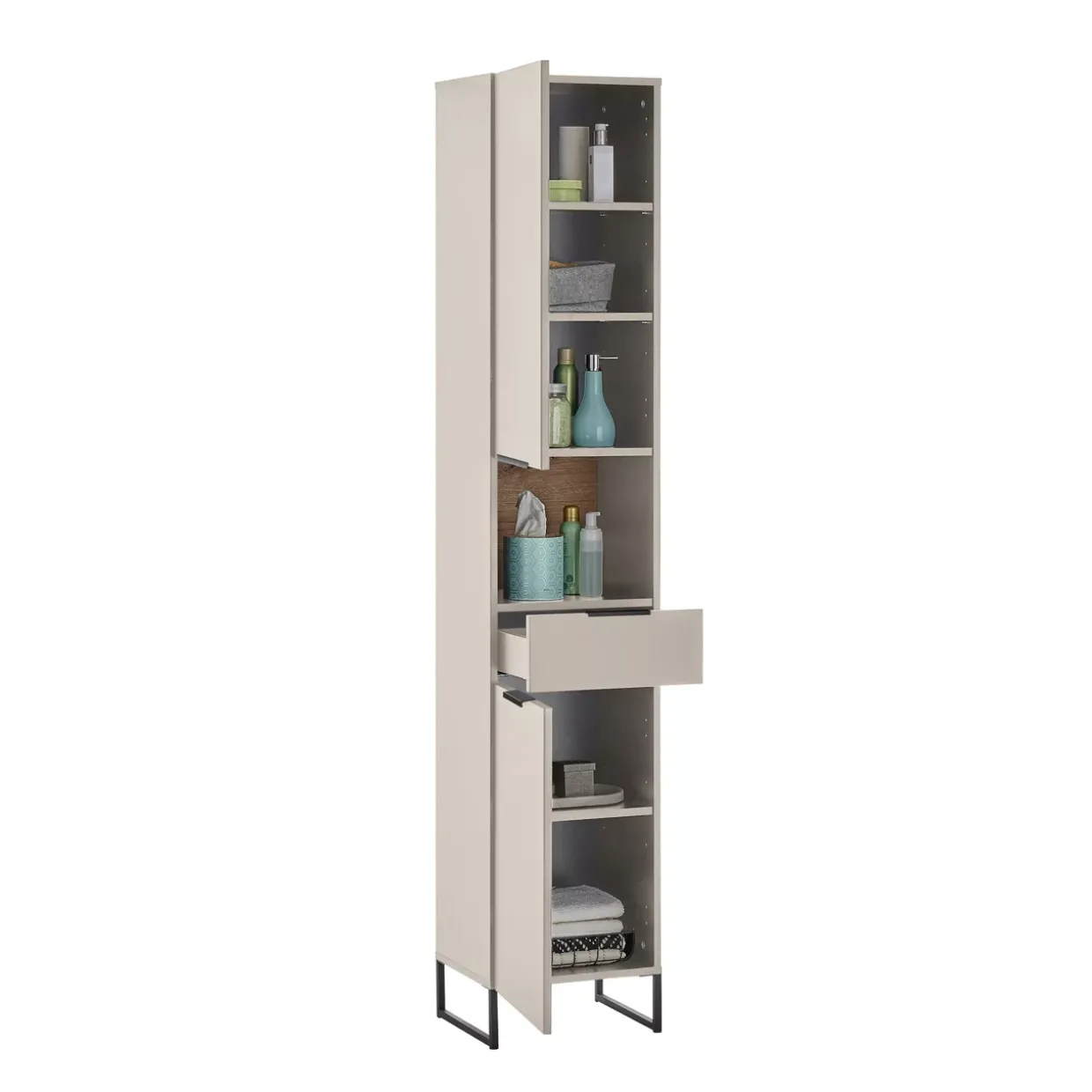 Kaschmirfarbene Eleganz prägt diesen modernen Badschrank, der sich nahtlos in jedes zeitgemäße Badezimmer einfügt. Die Verwendung von hochwertigem Holzwerkstoff verleiht dem Schrank nicht nur Stabilität, sondern auch eine angenehme Haptik und eine ansprechende Optik. Durch die Wahl von MDF als Hauptmaterial wird eine langlebige und pflegeleichte Oberfläche gewährleistet, die den täglichen Anforderungen im Badezimmer gewachsen ist.