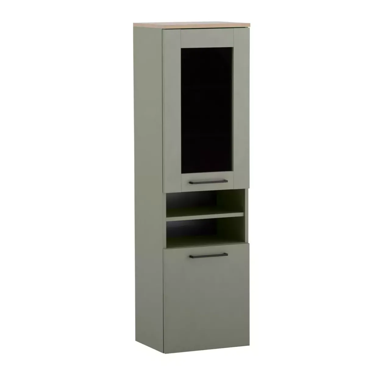 Eleganz trifft Funktionalität im Hochschrank Malo. Die moderne Kombination aus Glas, Holzwerkstoff und Metall verleiht diesem Möbelstück eine zeitgemäße Ästhetik, die in jedem Raum für einen stilvollen Akzent sorgt. Die harmonische Farbpalette, darunter Abdeckplatte Eiche, Rauchglas und Pistazie, fügt sich nahtlos in verschiedene Einrichtungsstile ein.Ein besonderes Highlight des Hochschranks ist die integrierte Soft-Close-Technologie. Dieses System sorgt dafür, dass Türen sanft und geräuschlos schließen, was sowohl die Langlebigkeit des Schranks als auch den Komfort im Alltag erhöht. Die Anschlagdämpfung ist ein weiteres durchdachtes Detail, das das Nutzungserlebnis optimiert.Flexibilität bietet die Möglichkeit, die Füße separat zu bestellen, sodass der Schrank individuell an Ihre Bedürfnisse angepasst werden kann. Diese Option eröffnet Ihnen die Freiheit, das Möbelstück an unterschiedliche Raumhöhen und Gestaltungskonzepte anzupassen.Durch die Verwendung hochwertiger Materialien und die durchdachte Konstruktion ist der Hochschrank nicht nur ein optischer Blickfang, sondern auch ein langlebiges Möbelstück. Ob im Wohnbereich oder im Büro, dieses Möbelstück verbindet Design und Funktion auf harmonische Weise und wird Ihnen lange Freude bereiten.