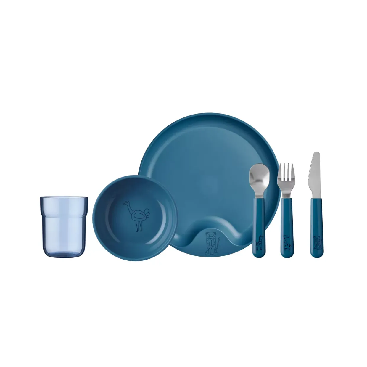 Deep blue, eine Farbe, die Ruhe und Eleganz vereint, prägt das 6-teilige Kindergeschirr-Set Mio. Dieses moderne Set, bestehend aus Besteck, einem Trinkglas, einem Teller und einem Schälchen, ist ideal für den ganzjährigen Einsatz. Hergestellt aus einer Kombination von Kunststoff und Edelstahl, ist es robust und langlebig.