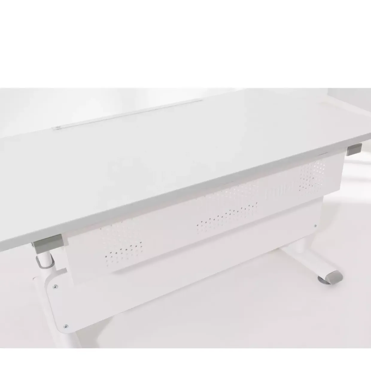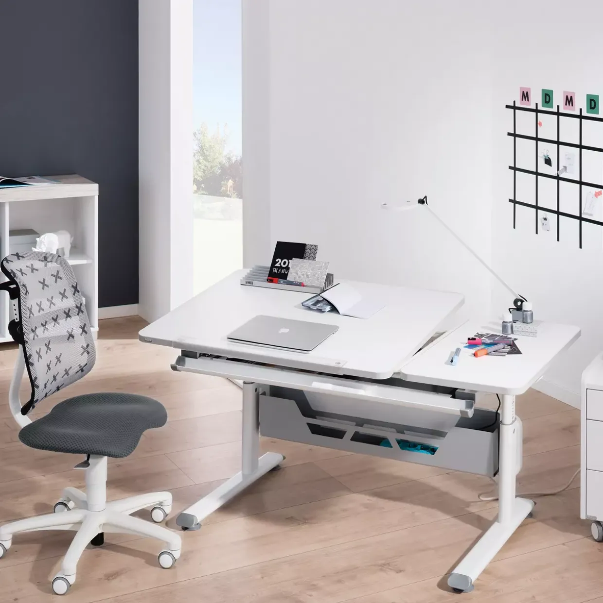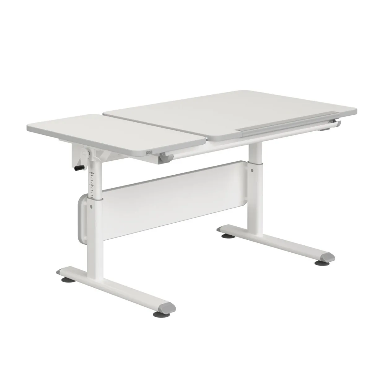 Ein einzigartiges Merkmal dieses modernen Schreibtisches ist die Höhenverstellbarkeit durch eine Kurbel, die Ihnen die Möglichkeit bietet, die Tischhöhe nach Ihren individuellen Bedürfnissen anzupassen. Mit einem stilvollen Design in kreideweiß fügt sich der Schoolworld perfekt in jedes zeitgenössische Interior ein. Gefertigt aus robustem Holzwerkstoff und Metall, vereint dieser Schreibtisch Langlebigkeit und Ästhetik.