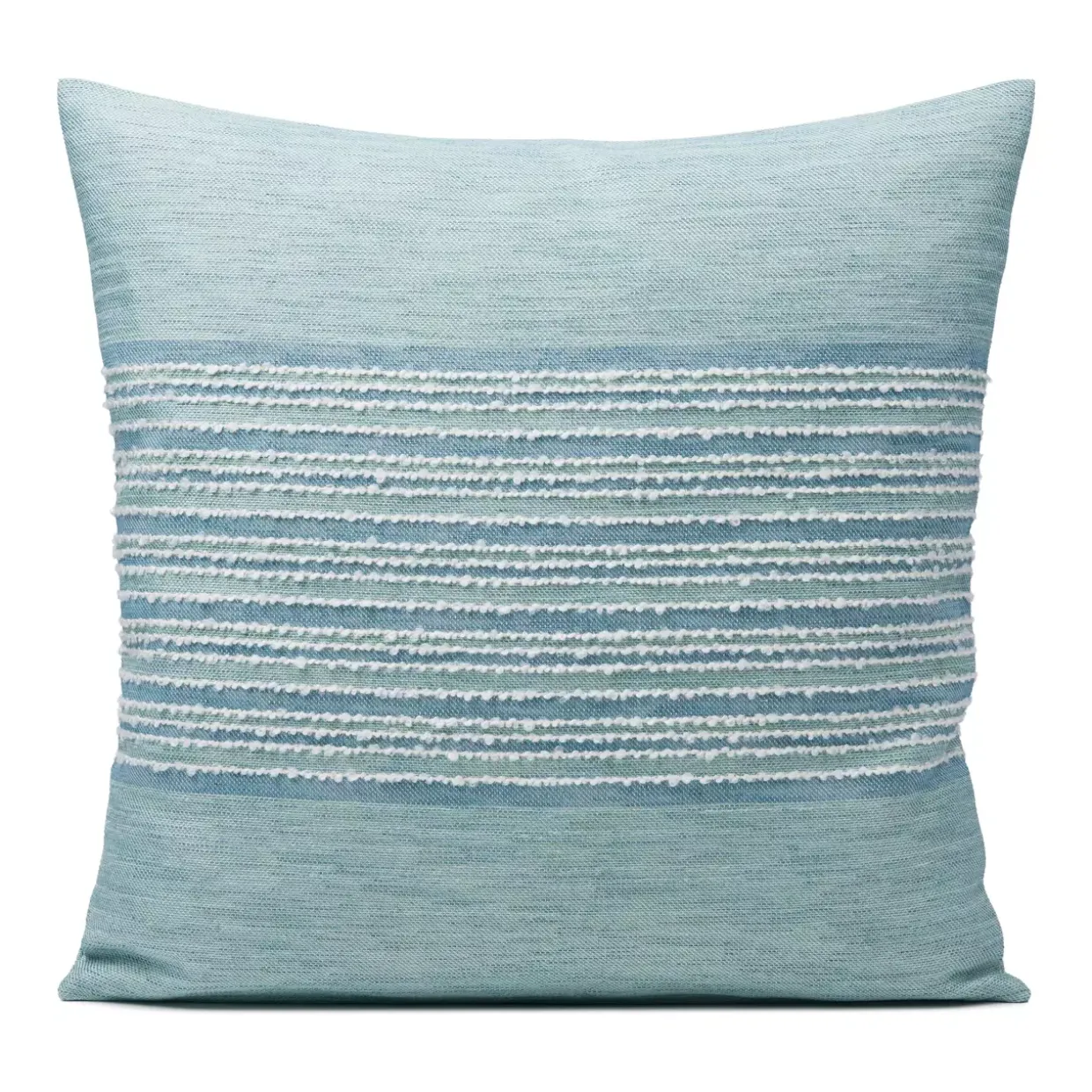 Ein Hauch von AQUA verleiht dieser modernen Kissenhülle eine erfrischende Sommerbrise, die jeden Wohnraum belebt. Mit ihrem quadratischen Format fügt sie sich nahtlos in unterschiedliche Einrichtungsstile ein. Das Design besticht durch ein mittig platziertes, quergestreiftes Muster, das subtile Akzente setzt und gleichzeitig zeitgemäß wirkt.