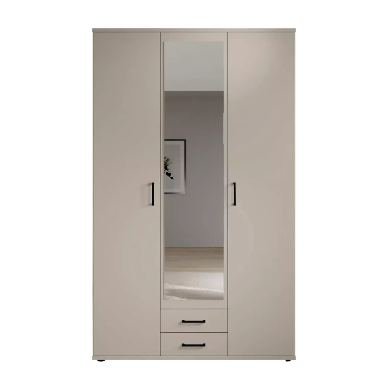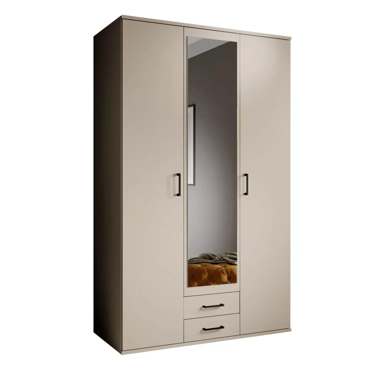 Ein Hauch von Eleganz durchzieht den modernen Stil des Kleiderschranks, der in einem ansprechenden Dekor kaschmir gestaltet ist. Der Einsatz von hochwertigem Holzwerkstoff verleiht diesem Möbelstück nicht nur Stabilität, sondern sorgt auch für eine warme und einladende Atmosphäre. Vielseitigkeit ist das Schlüsselwort: Mit zwei geräumigen Schubkästen bietet der Kleiderschrank reichlich Stauraum für Kleidungsstücke und Accessoires. Diese Funktionalität wird durch eine zentral platzierte Spiegeltür ergänzt, die nicht nur praktisch ist, sondern auch den Raum optisch vergrößert und aufhellt. Die moderne Ästhetik des Kleiderschranks harmoniert mühelos mit verschiedenen Einrichtungsstilen und bietet Ihnen die Möglichkeit, Ihr Schlafzimmer mit einem zeitgemäßen Touch zu bereichern. Die klare Linienführung und das dezente Farbspiel machen diesen Schrank zu einem zeitlosen Begleiter in Ihrem Zuhause. Praktikabilität trifft auf Design: Die Kombination aus Schubkästen und Spiegeltür gewährleistet eine optimale Nutzung des zur Verfügung stehenden Platzes. Dieser Kleiderschrank ist nicht nur ein Möbelstück, sondern ein durchdachter Begleiter für Ihren Alltag, der Funktionalität mit Stil vereint und dabei hilft, Ihr Wohnambiente in ein harmonisches Gesamtbild zu verwandeln. Tauchen Sie ein in die Welt des modernen Wohnens und erleben Sie die gelungene Symbiose aus Design und Nutzen.