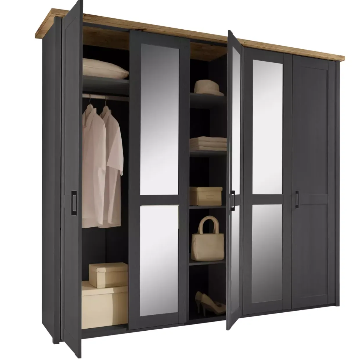 Besonders praktisch sind die zwei großen und vier kleinen Einlegeböden, die eine flexible Organisation Ihrer Garderobe ermöglichen. Die Drehtüren sorgen für eine leichte Handhabung und bieten gleichzeitig eine optimale Raumaufteilung. Ein zusätzlicher Hingucker ist der Kranz in Artisan Eiche Nachbildung, der dem Schrank eine besondere Note verleiht.