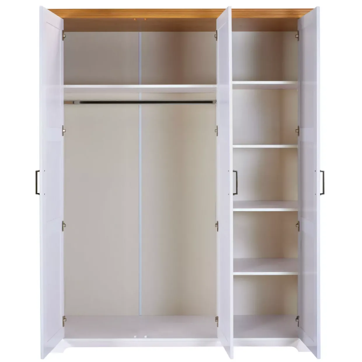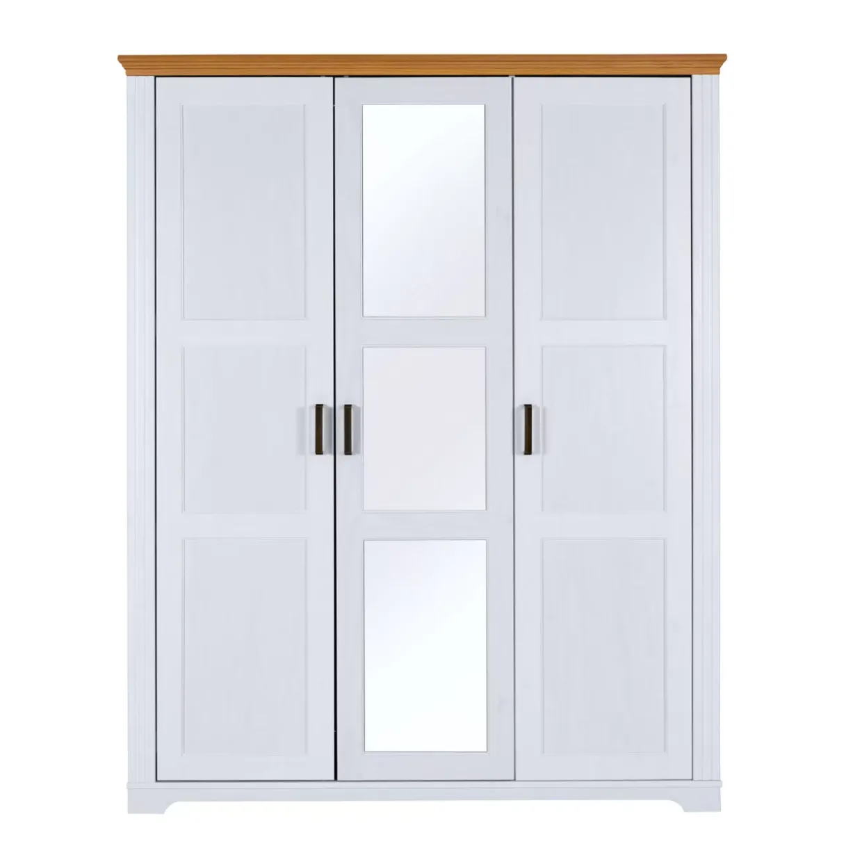 Der Maluno Kleiderschrank beeindruckt mit seinem charmanten Cottage-Stil. Harmonisch fügt sich die Kombination aus massiv weiß lackiertem Kiefernholz und elegante Eiche in jedes Schlafzimmerambiente ein. Besonders hervorzuheben ist die hochwertige Verarbeitung aus robustem Holz, das für Langlebigkeit und eine warme Ausstrahlung sorgt.