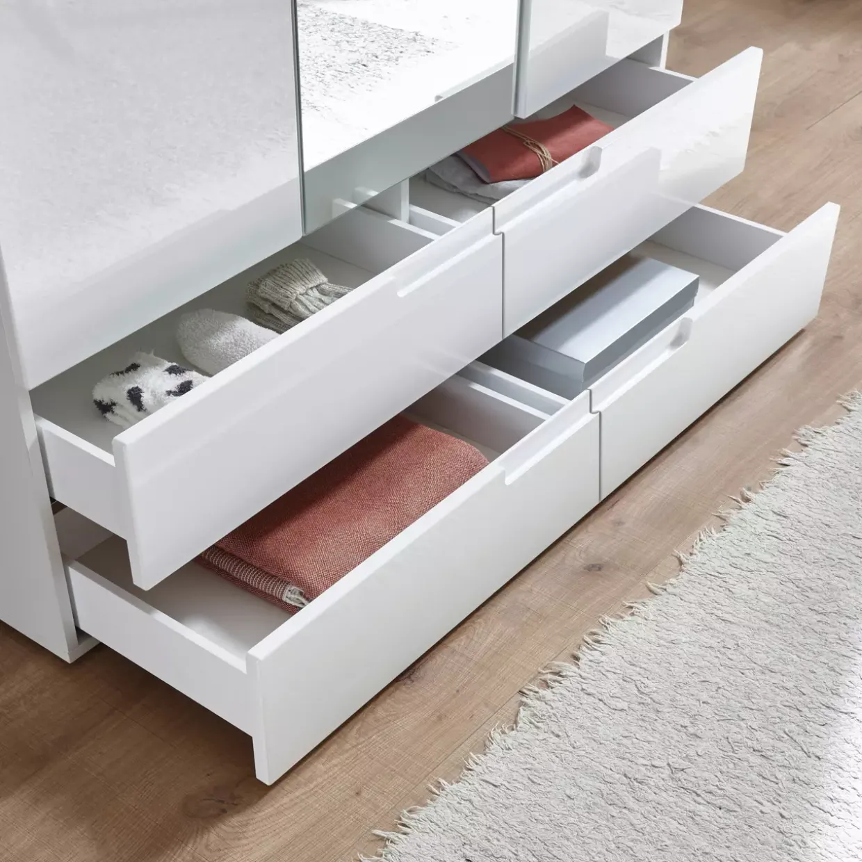 Hochwertige Holzwerkstoffe bilden das Herzstück dieses Möbelstücks und garantieren eine stabile und langlebige Konstruktion. Die melaminharzbeschichtete Oberfläche sorgt nicht nur für eine edle Optik, sondern bietet auch Schutz vor Kratzern und Feuchtigkeit, was die Pflege des Schranks erleichtert.