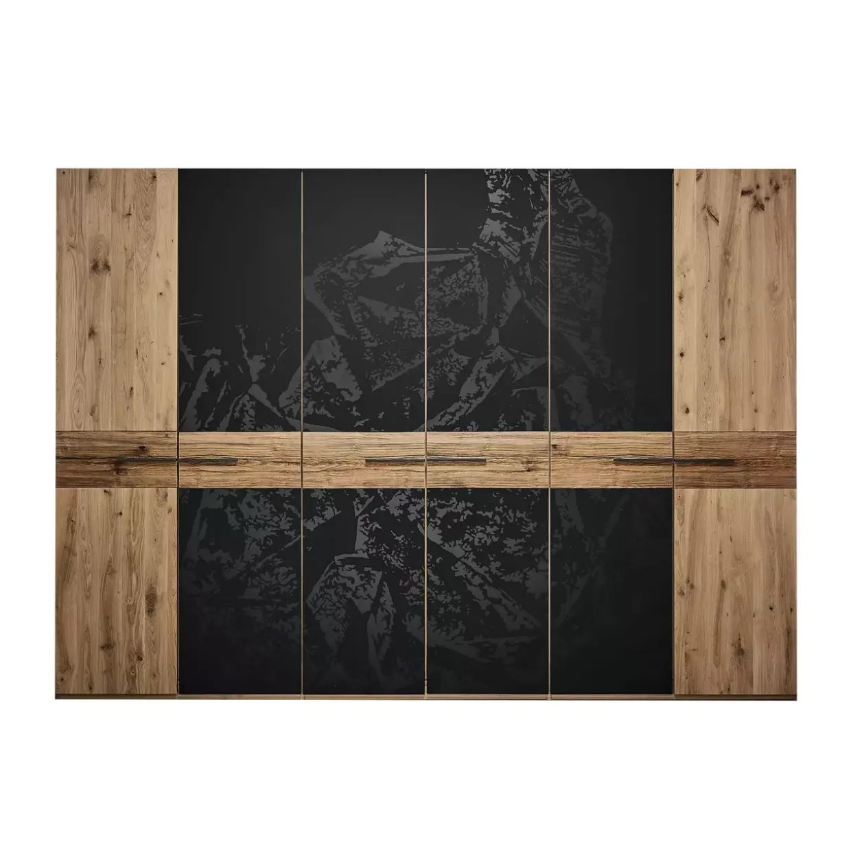 | Color | Wildeiche gebürstet / Spaltholz / Color-Glas graphit Kristallmotiv / Griffe Eisenglimmer |