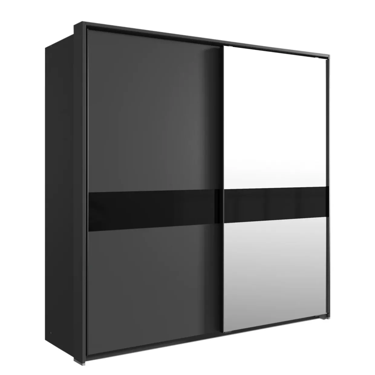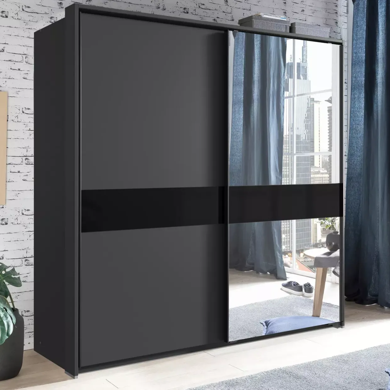 Die farbliche Gestaltung in Graphit und schwarzem Glas sorgt nicht nur für eine optische Tiefe, sondern auch für eine harmonische Integration in verschiedene Einrichtungsstile. Der Spiegeleffekt der Türen verleiht dem Raum zusätzlich Weite und Eleganz.