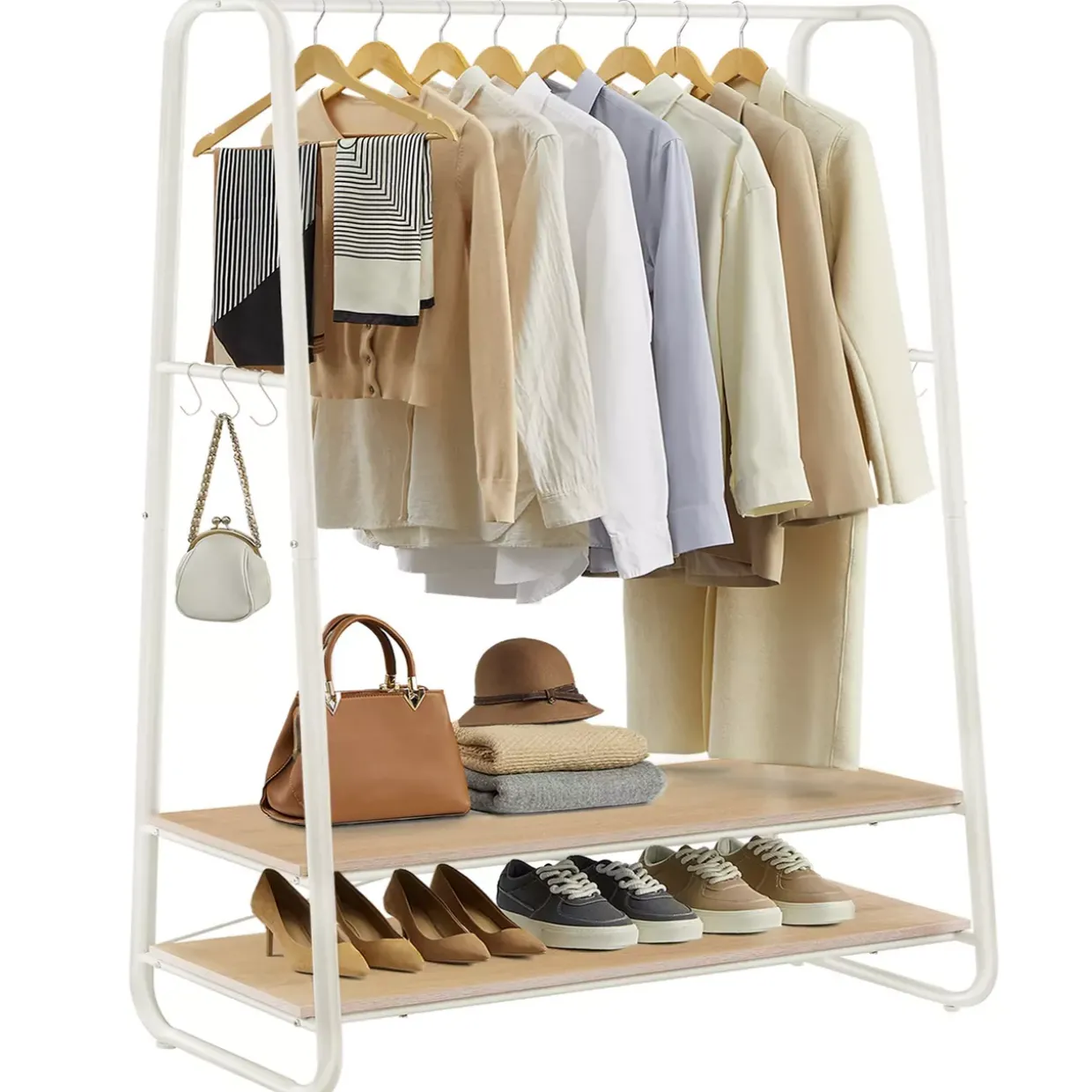 Der RGR112W09 Kleiderständer bringt skandinavische Eleganz in Ihr Zuhause. In den stilvollen Farben Weiß und Beige gehalten, fügt sich dieses Möbelstück harmonisch in jedes Raumkonzept ein. Das Material, eine Kombination aus robustem Holzwerkstoff und feinem Eisen, bietet eine ansprechende Mischung aus Stabilität und Leichtigkeit.
