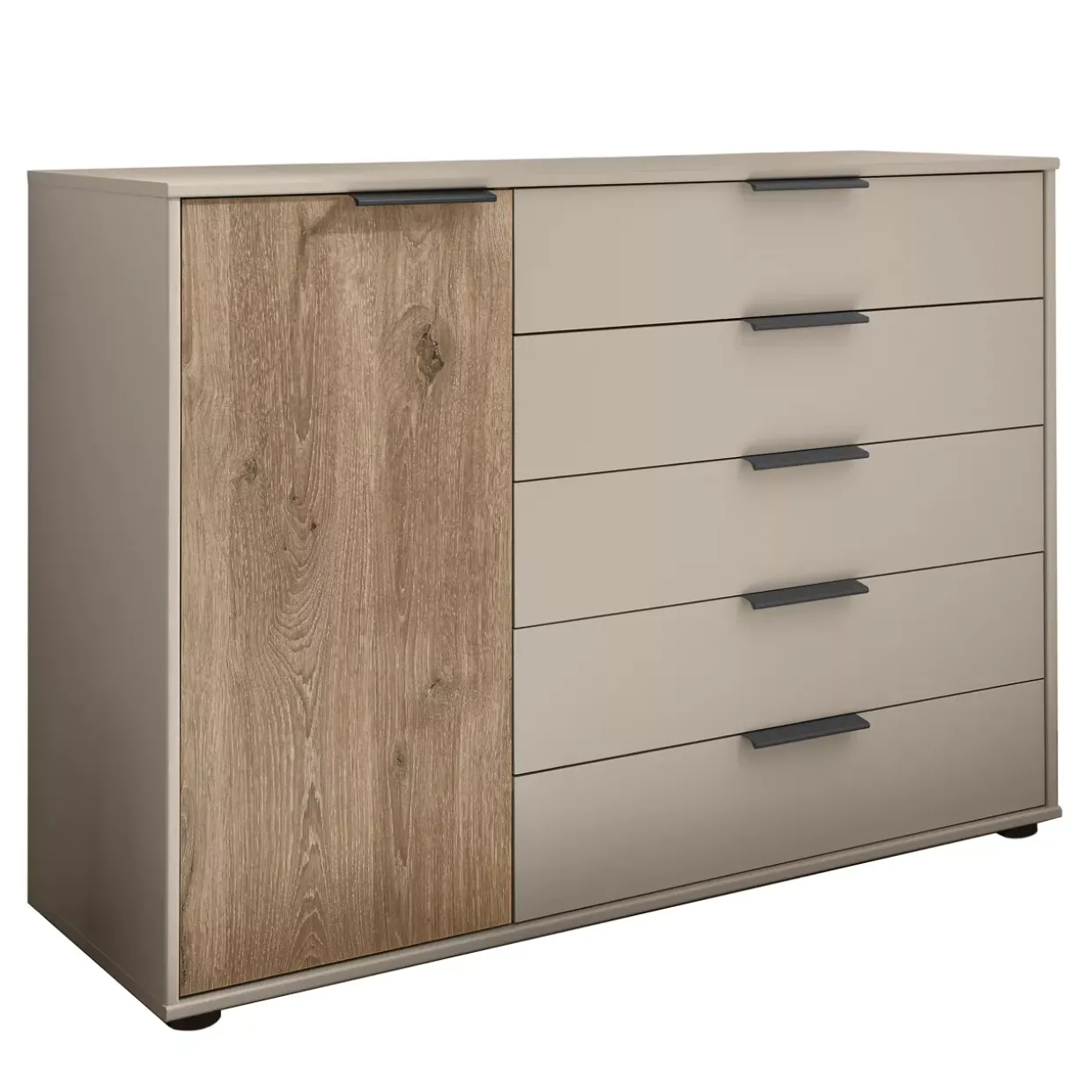 Farbton: Korpus Kieselgrau Dekor / Front Kieselgrau Dekor & Nordic-Eiche Nachbildung / Innenmaterial Treeline / Griffe Schiefer