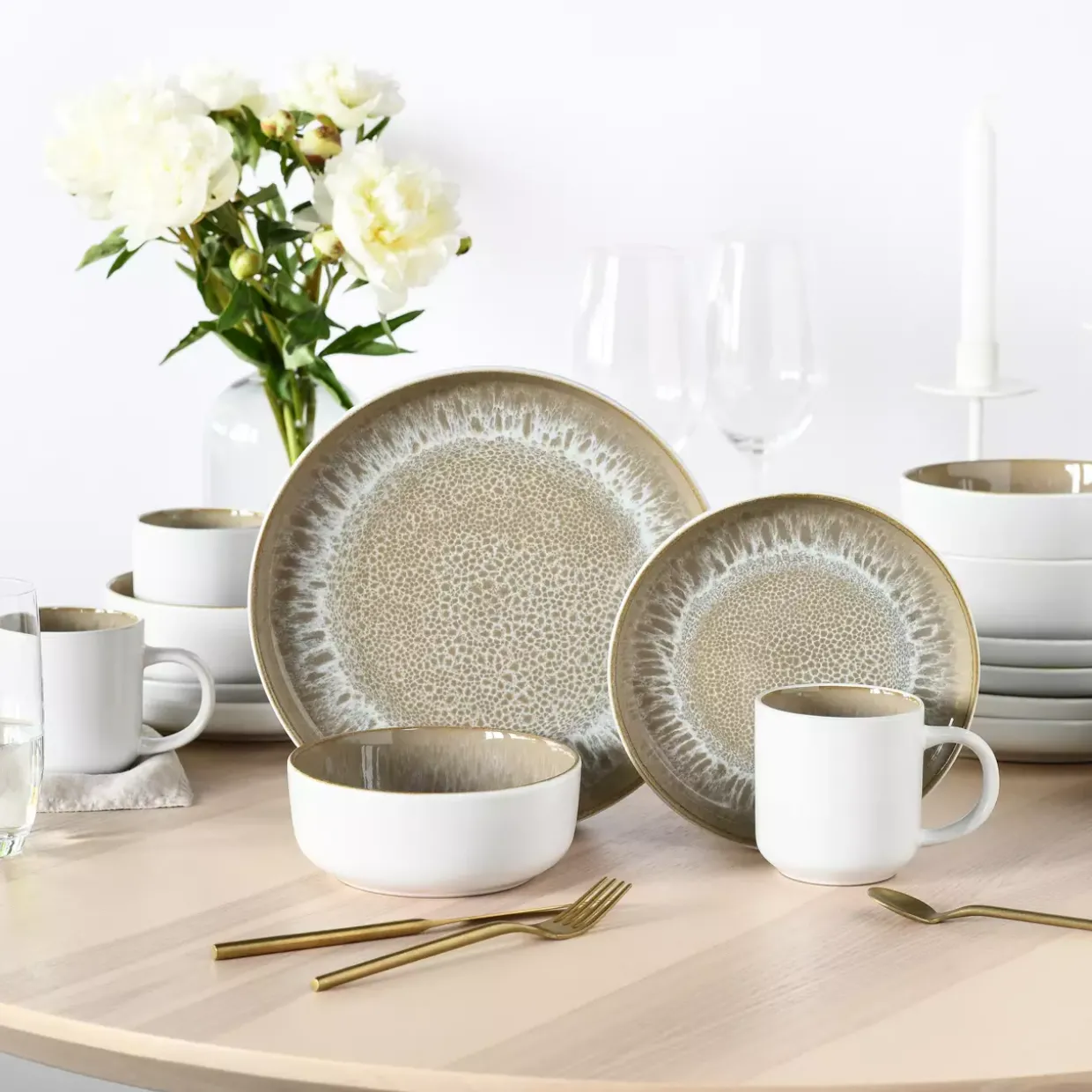 Beige Eleganz trifft auf modernes Design: Dieses Kombiservice im stilvollen Set zieht alle Blicke auf sich. Mit seiner schlichten Uni-Optik und den dezenten Punkten passt es perfekt in jede zeitgenössische Küche und verleiht Ihrem Esstisch eine besondere Note.