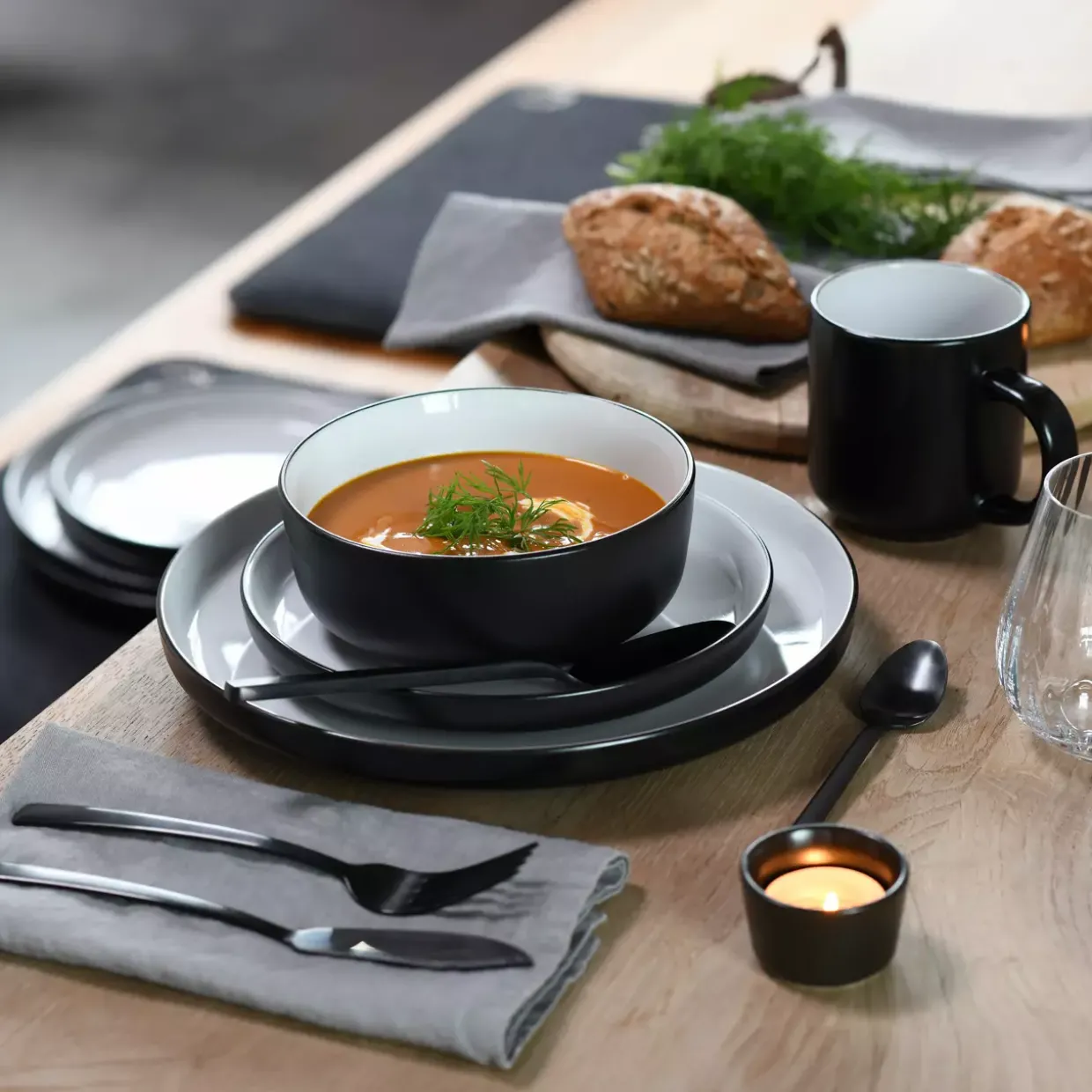 Cool Black – eine Farbe, die Eleganz und Moderne vereint. In der Welt der Tischkultur sticht das Nordic Kombiservice mit seiner runden Form und seinem modernen Stil hervor. Gefertigt aus hochwertigem Steinzeug, bietet dieses 16-teilige Set eine glänzende Oberfläche, die jedem gedeckten Tisch einen Hauch von Raffinesse verleiht.