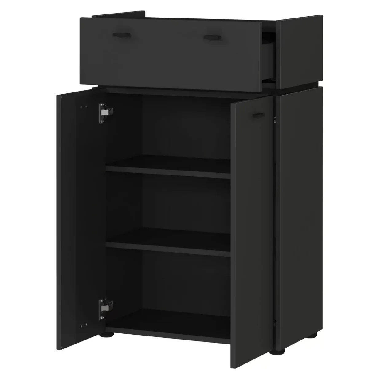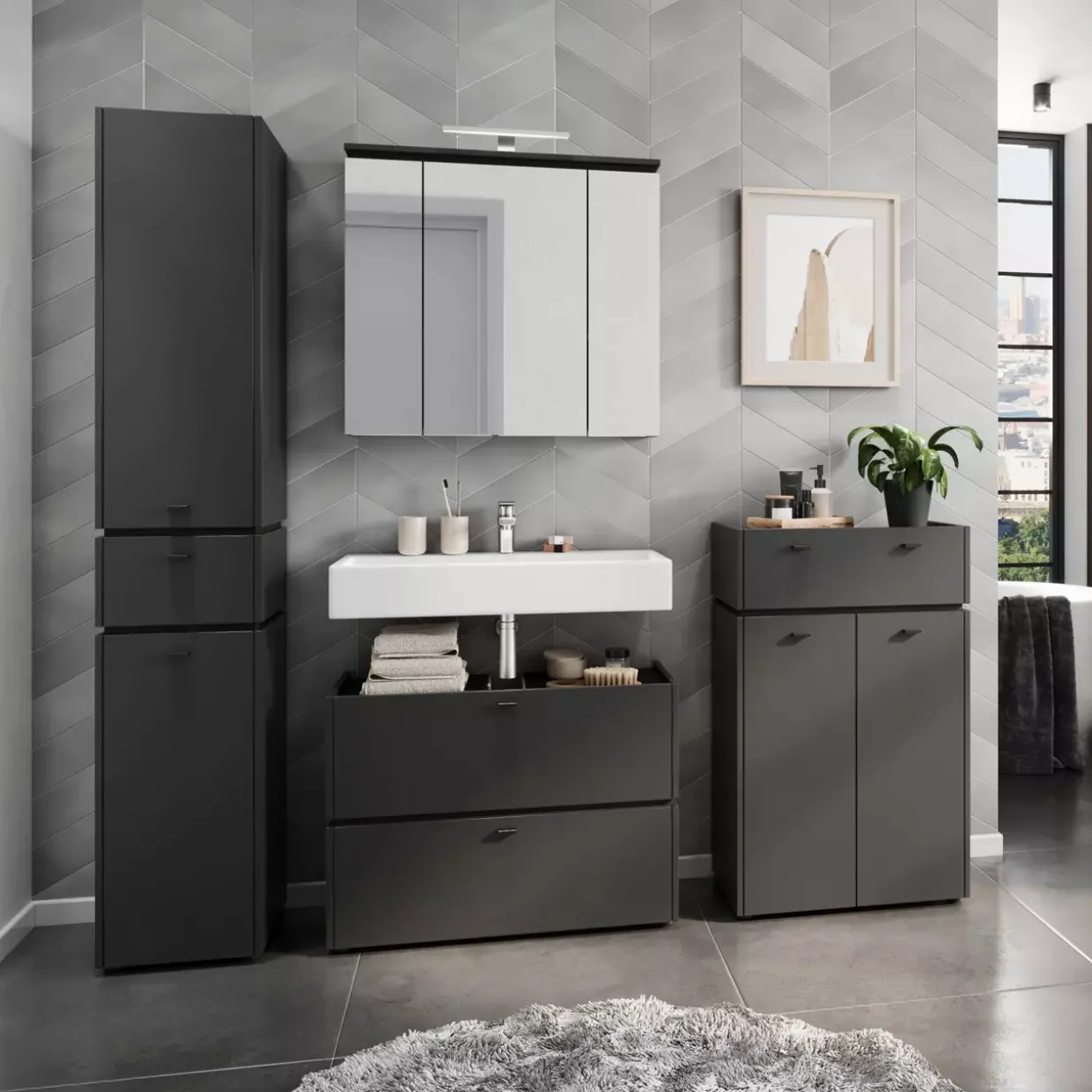Kratzfeste und widerstandsfähige Oberflächen zeichnen die Kommode Modesto aus, die in einem modernen Stil gestaltet ist. Die Farbpalette aus Anthrazit, Graphit und Schwarz verleiht dem Möbelstück einen eleganten Touch und fügt sich harmonisch in zeitgemäße Wohnräume ein.