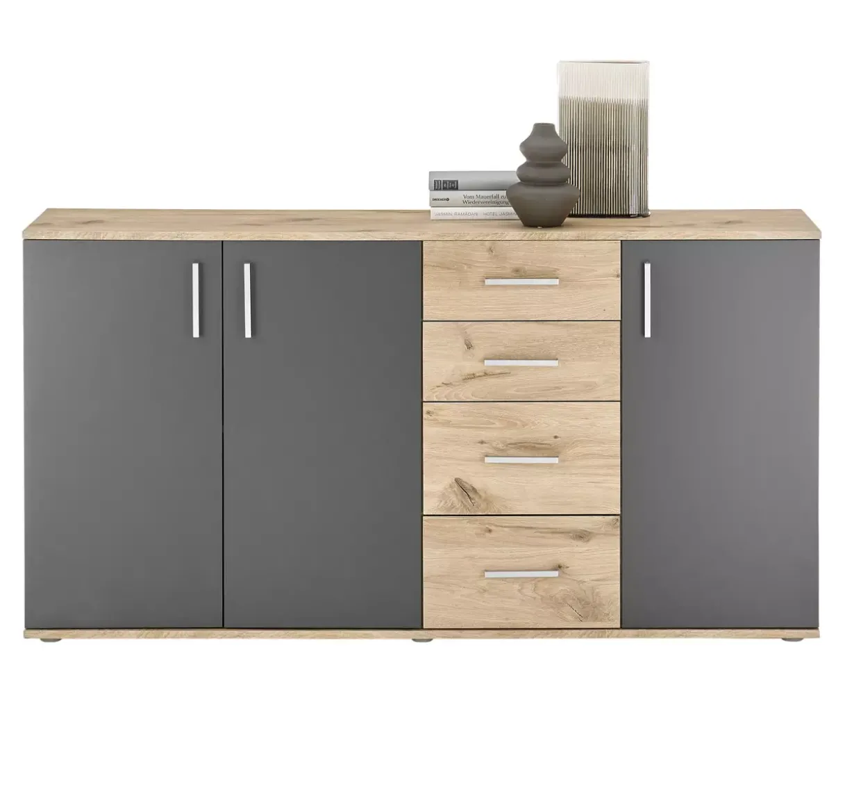 Holzwerkstoff als Material verleiht der Kommode eine beeindruckende Stabilität und Langlebigkeit. Diese moderne Kommode beeindruckt mit ihrem stilvollen und zeitgemäßen Design, das sich perfekt in verschiedene Einrichtungsstile einfügt. Der warme Braunton, kombiniert mit elegantem Grau, schafft eine harmonische Verbindung, die sowohl in klassischen als auch in modernen Räumen Akzente setzt. Mit drei Türen und vier Schubladen bietet die Kommode reichlich Stauraum für unterschiedlichste Bedürfnisse.