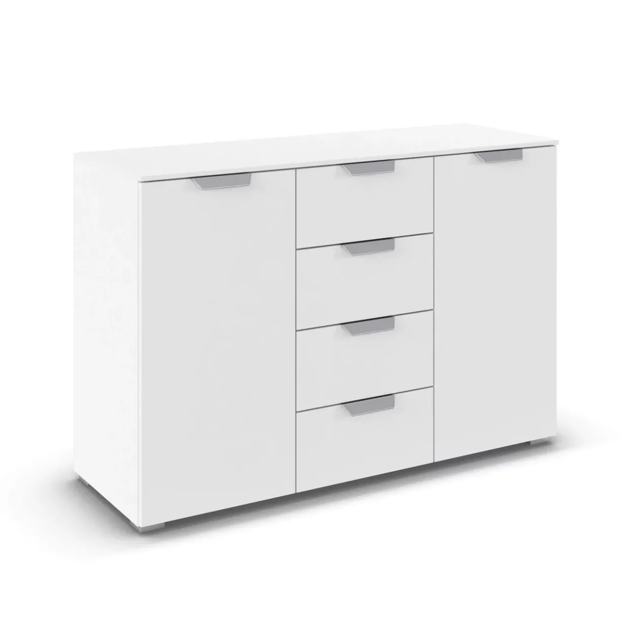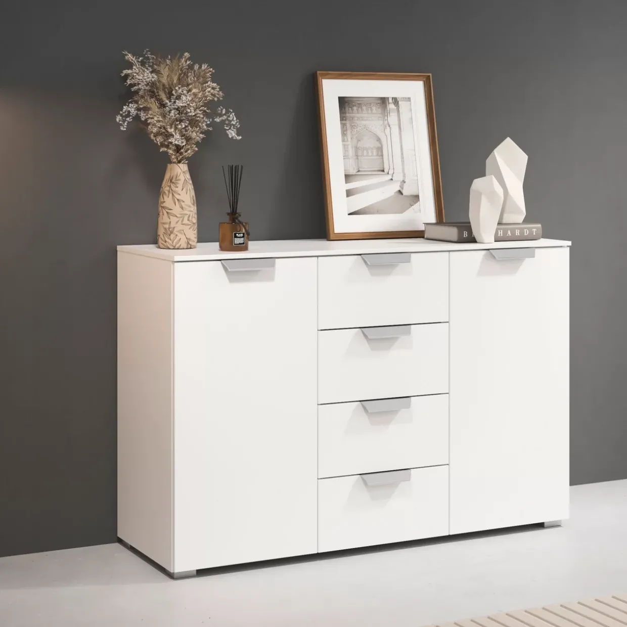 Der Holzwerkstoff, aus dem die Kommode gefertigt ist, verspricht Langlebigkeit und Stabilität. Mit zwei Türen und vier Schubkästen, die über Selbsteinzug und Dämpfung verfügen, bietet sie ausreichend Platz und Komfort für die tägliche Nutzung. Die klare Linienführung und der elegante Materialmix machen diese Kommode zu einem stilvollen Highlight in jedem Raum.