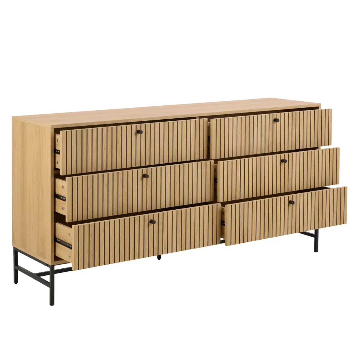 Die rechteckige Form dieser Kommode fügt sich harmonisch in jeden Raum ein und verleiht Ihrem Zuhause einen Hauch von Boho-Charme. Mit einer ansprechenden Kombination aus Melamin Eiche rau und Schwarz Matt setzt das Möbelstück stilvolle Akzente, die sowohl modern als auch zeitlos wirken. Sechs Einheiten bieten reichlich Stauraum, um Ordnung zu schaffen und Ihre Wohnräume aufgeräumt zu halten.Gefertigt aus robustem Holzwerkstoff und hochwertigem Stahl, verspricht die Kommode Langlebigkeit und Stabilität. Die quadratischen Rohrfüße aus pulverbeschichtetem Metall garantieren einen sicheren Stand und unterstreichen das elegante Design. Die melaminharzbeschichtete Oberfläche schützt das Möbelstück vor Kratzern und erleichtert die Pflege.Einfach in der Pflege, verlangt die Kommode lediglich ein gelegentliches Abwischen mit einem feuchten Tuch. Anschließend sollte die Oberfläche gut trocken gewischt werden, um ihre Schönheit zu bewahren. Es ist ratsam, Scheuermittel und harte Gegenstände zu vermeiden, um die Oberfläche nicht zu beschädigen. Mit ihrer schlichten Eleganz und praktischen Funktionalität ist diese Kommode die perfekte Ergänzung für jeden Wohnraum, der Wert auf Ästhetik und Ordnung legt.