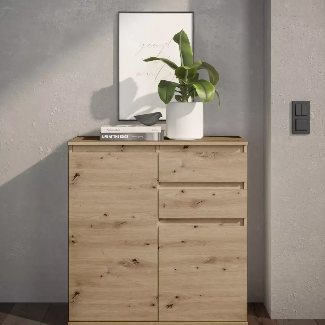Holzwerkstoff in seiner schönsten Form – die Kommode 2 präsentiert sich in einem modernen Stil, der jedes Zuhause aufwertet. Mit ihrer ansprechenden Artisan-Farbe fügt sie sich nahtlos in verschiedene Wohnkonzepte ein und sorgt für eine warme Atmosphäre. Als Beimöbel lässt sie sich vielseitig einsetzen, ob im Wohnbereich, Schlafzimmer oder Flur.