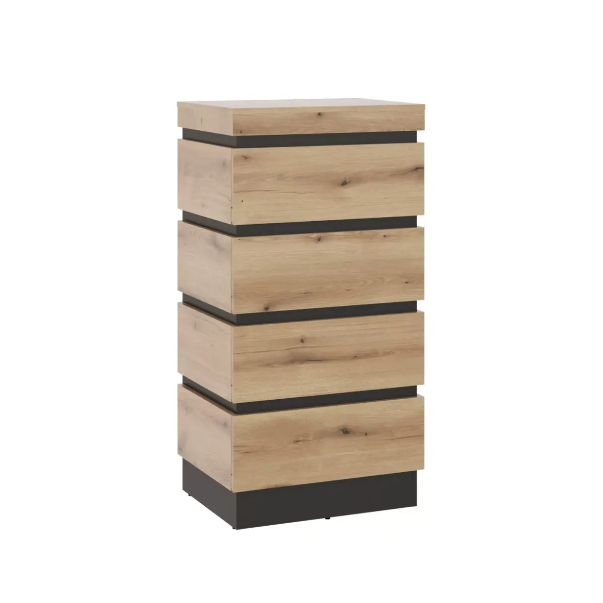 Vier geräumige Schubladen bieten ausreichend Stauraum für alles, was Sie in Ihrem Wohnraum ordentlich verstauen möchten. Die klare Linienführung und das harmonische Design lassen die Kommode sowohl in modernen als auch klassischen Einrichtungsstilen erstrahlen. Hochwertige Materialien sorgen für eine langlebige Nutzung und verleihen dem Möbelstück eine besondere Wertigkeit.