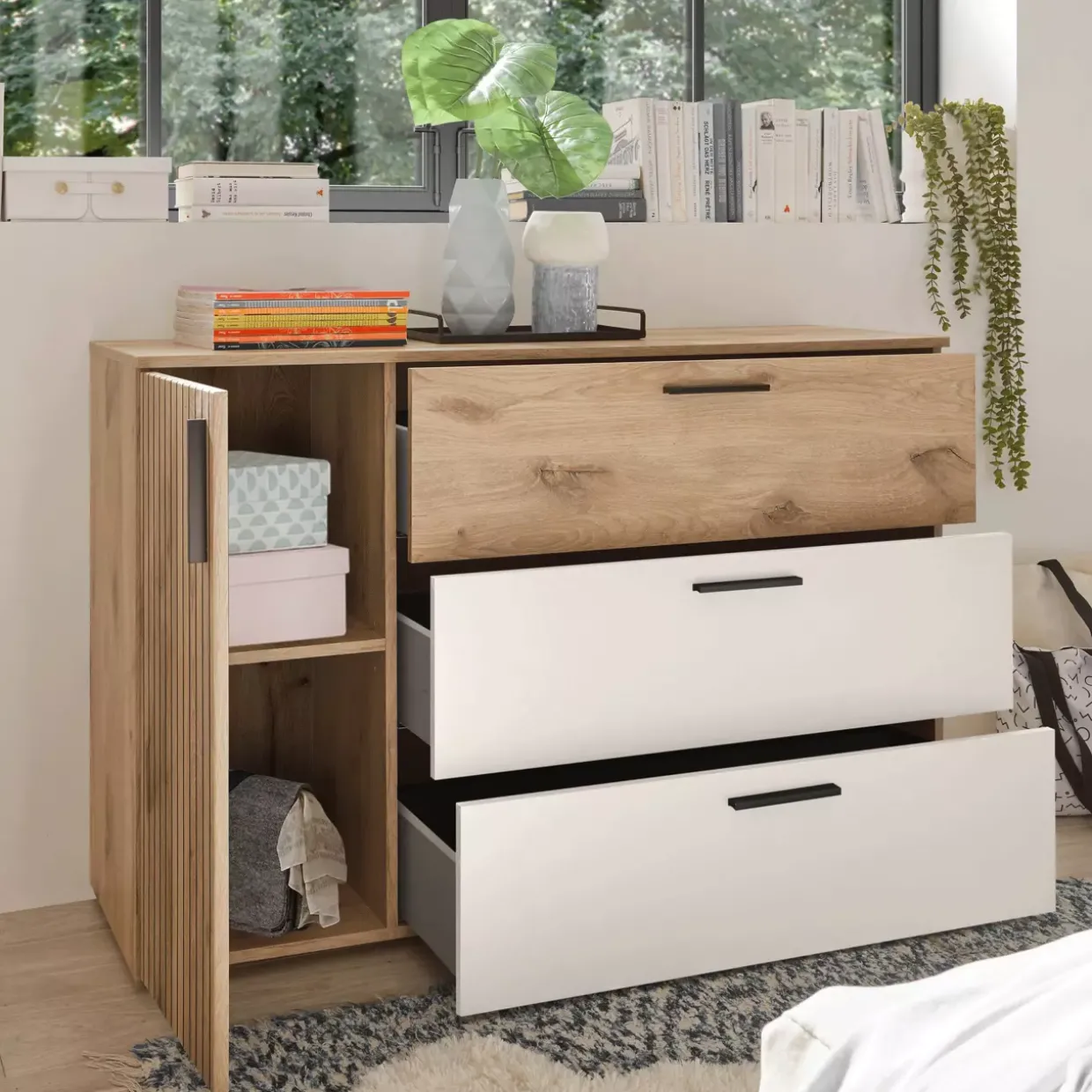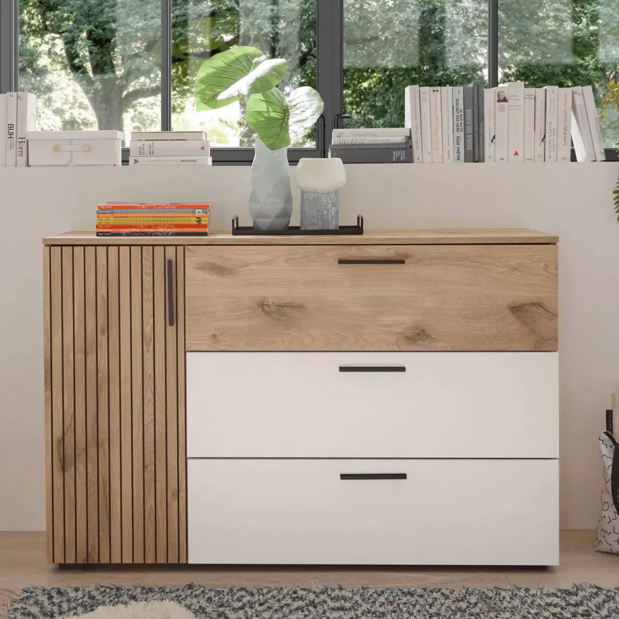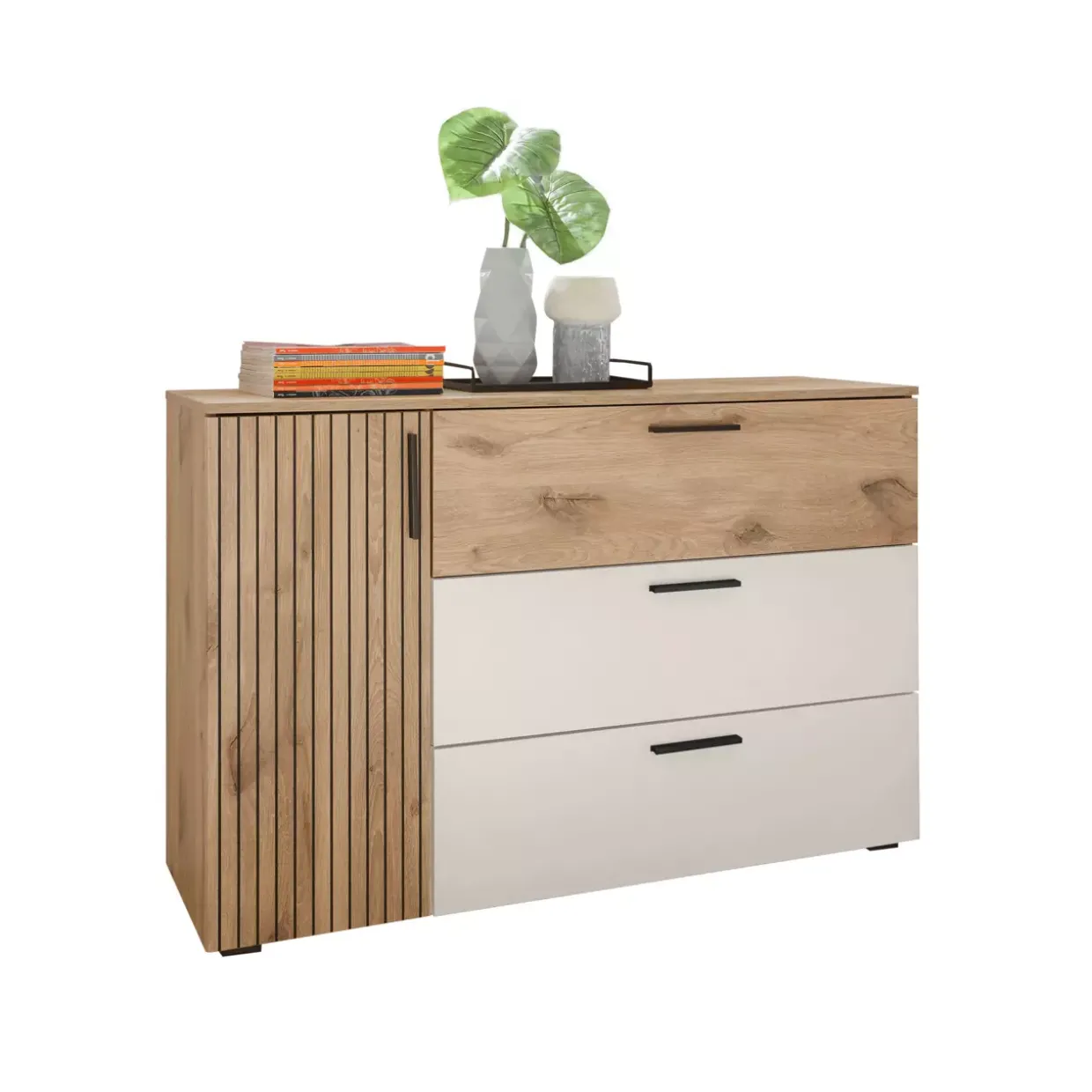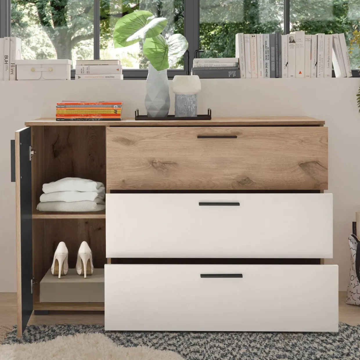 Helle Farbtöne wie Viking Oak hell und Weiß verleihen der Kommode eine angenehme Leichtigkeit, die sich harmonisch in moderne Wohnkonzepte einfügt. Die klare Linienführung und der schlichte Look machen sie zu einem vielseitigen Element, das sich sowohl in Wohn- als auch in Schlafräumen gut integrieren lässt.