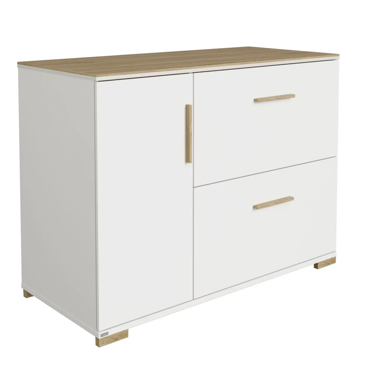 Scandi-Charme trifft auf Funktionalität in dieser eleganten Kommode. Der subtile Off-White-Ton harmoniert hervorragend mit der Deckplatte und den Griffen in Eiche-Montana-Dekor und verleiht jedem Raum eine zeitlose Ästhetik. Gefertigt aus hochwertigem Holzwerkstoff, bietet die Kommode sowohl Stabilität als auch Langlebigkeit.