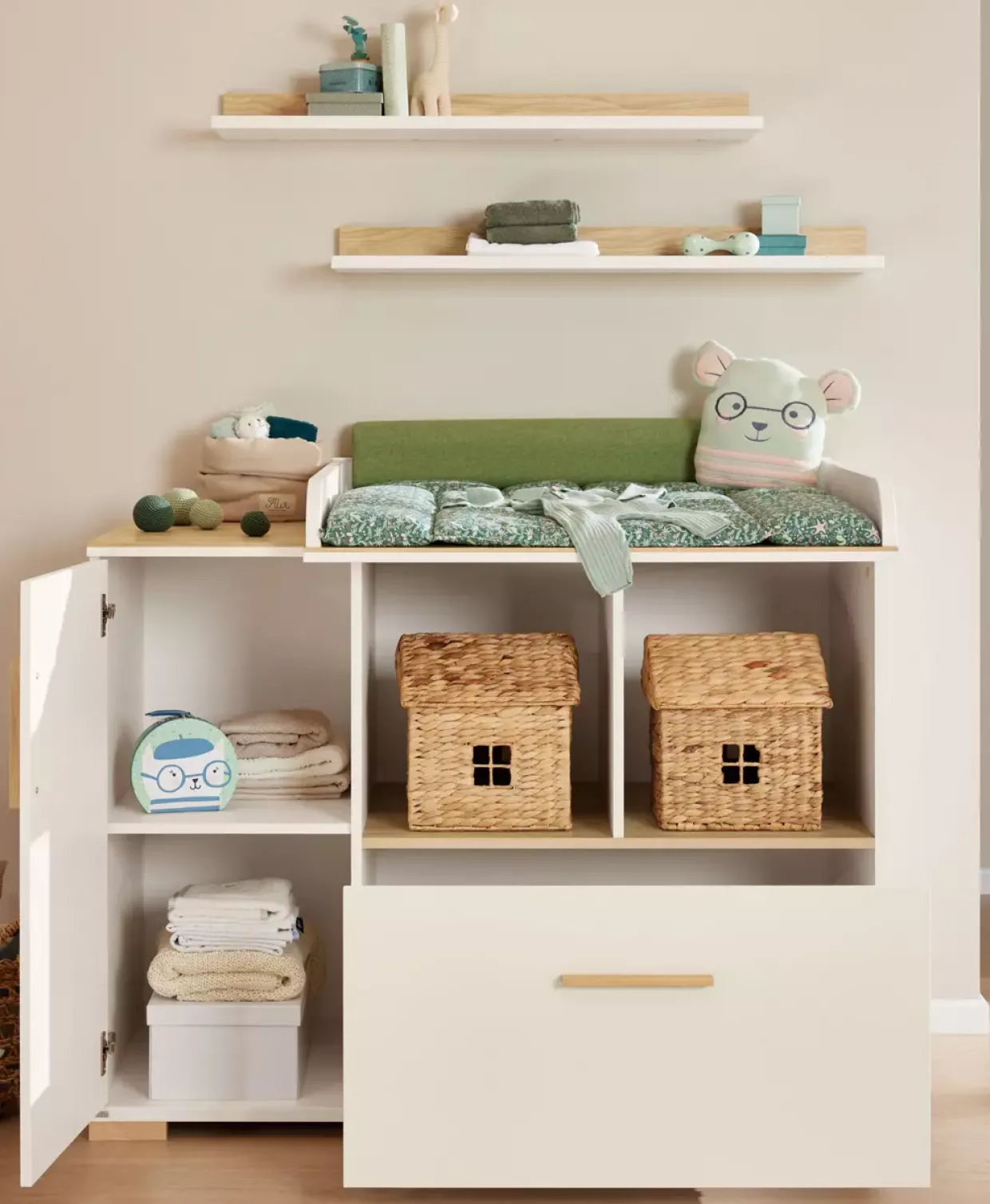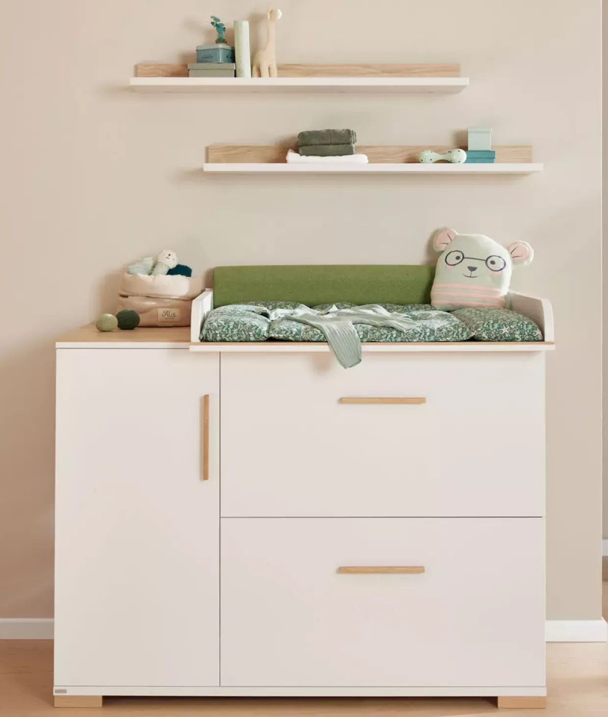 Für junge Familien bietet sich die Möglichkeit, einen passenden Wickelaufsatz gegen Mehrpreis zu erwerben. Diese optionale Erweiterung verwandelt das Möbelstück in einen multifunktionalen Helfer im Kinderzimmer. Die Kombination aus schlichter Eleganz und praktischen Details macht die Kommode zu einem idealen Möbelstück für alle, die skandinavischen Stil zu schätzen wissen.