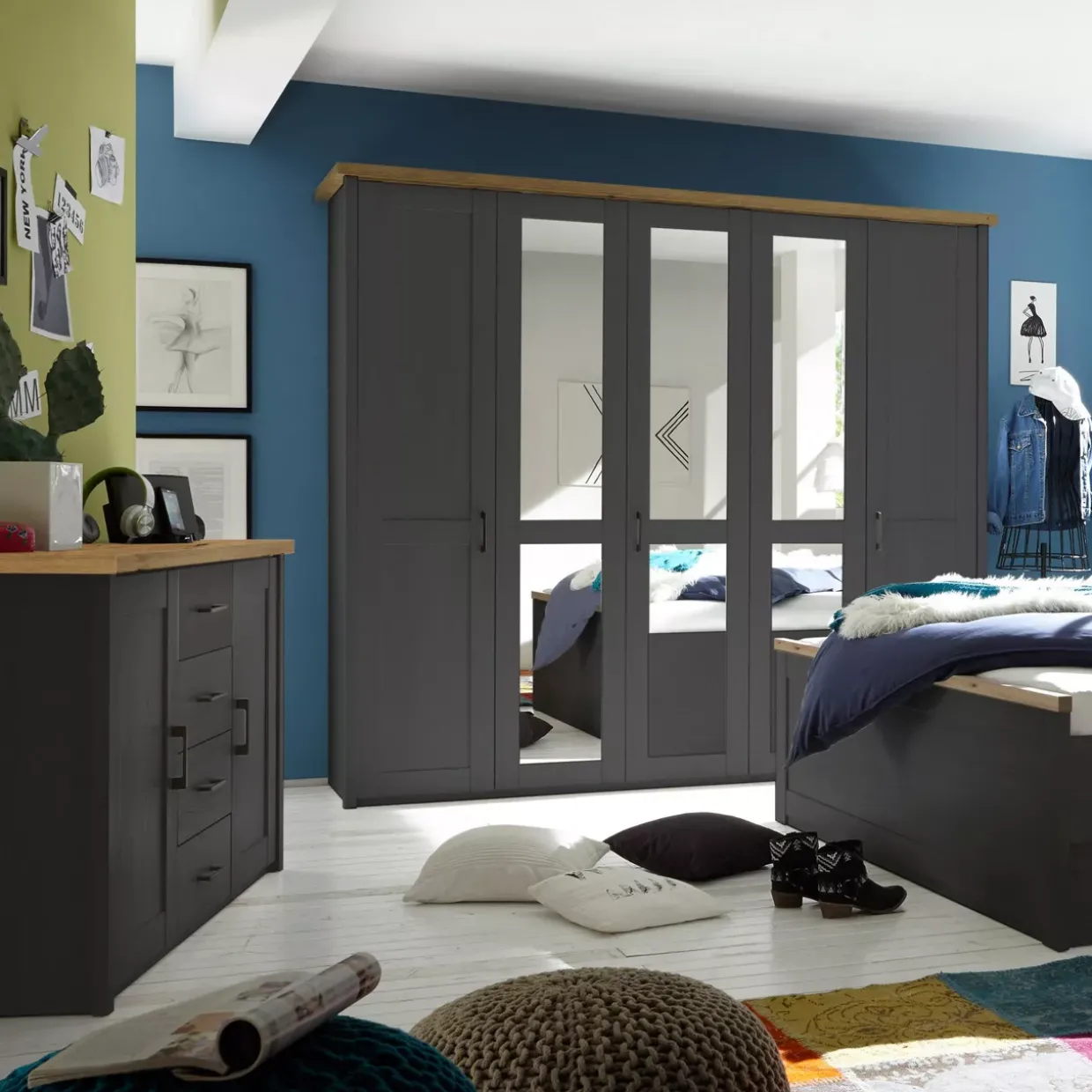 Farbton: Graphit / Abs.Artisan Eiche / Füße Graphit / Front Graphit Nachbildung / Front Absetzung Artisan Eiche Nachbildung / Griffe Graphit