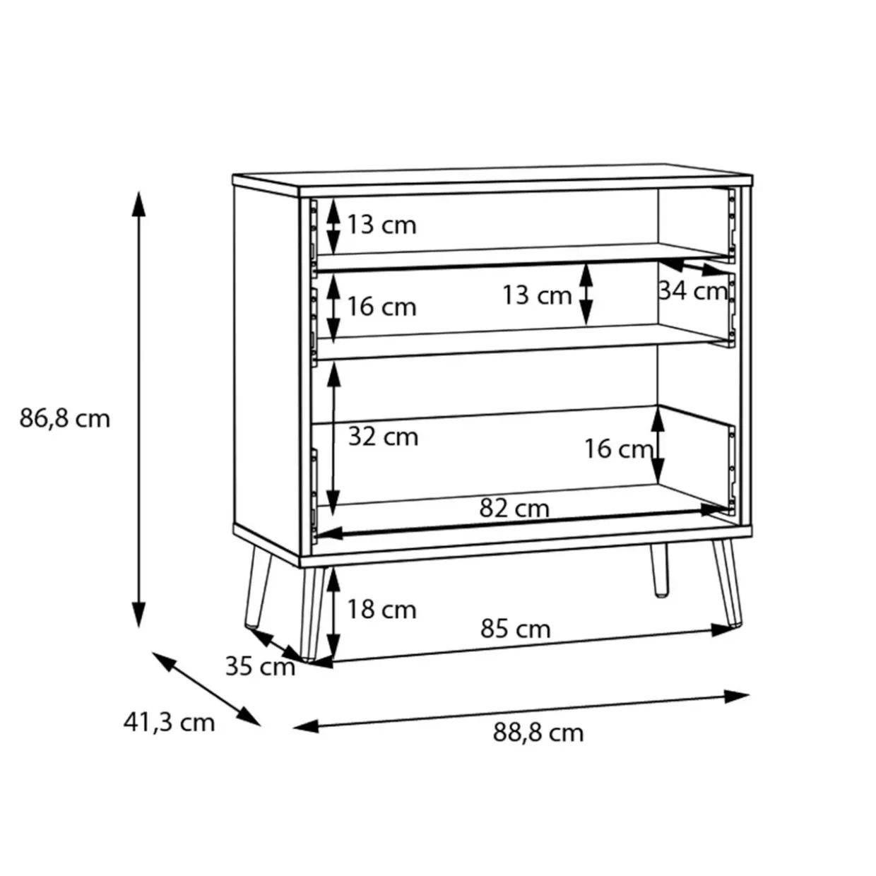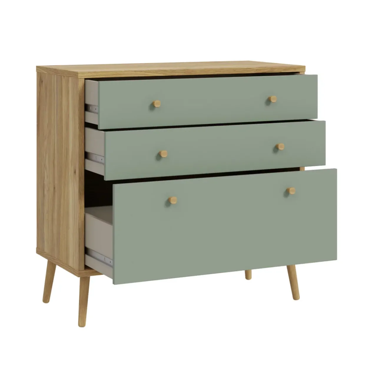 Mit drei großzügigen Schubladen ausgestattet, bietet die Kommode ausreichend Stauraum für Ihre persönlichen Gegenstände. Die klare Linienführung und das 4-Fußgestell aus hochwertigem Holzwerkstoff verleihen dem Möbelstück eine stabile und dennoch leichte Präsenz. Die raffinierte Verarbeitung und das sorgfältig ausgewählte Material sprechen für eine lange Lebensdauer und eine beständige Qualität.