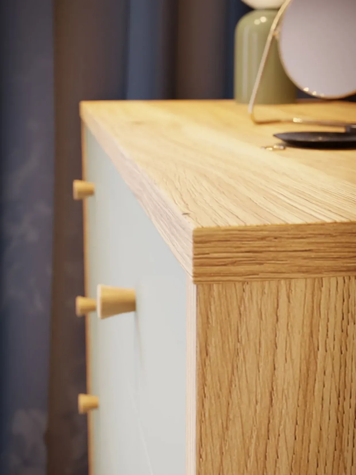 Mauvella Eiche verleiht der Whenua Kommode ein elegantes und modernes Erscheinungsbild. Diese Kommode, ein wahres Meisterwerk des zeitgenössischen Designs, fügt sich nahtlos in jedes Interieur ein. Die harmonische Kombination aus verschiedenen Farbtönen wie Eiche natur und Salbei grün bietet zahlreiche Gestaltungsmöglichkeiten, die Ihr Zuhause in neuem Glanz erstrahlen lassen.
