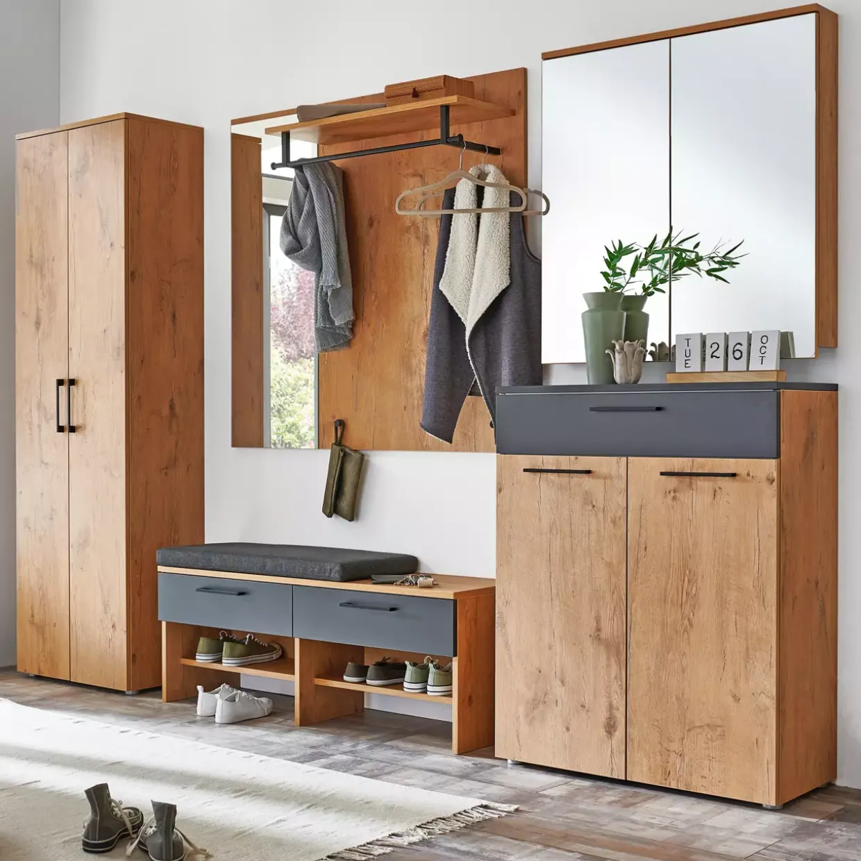 Die einzigartige Kombination aus Wildeiche Nachbildung und Anthrazit verleiht der Faro-Kommode ein modernes Flair. Zwei dieser eleganten Möbelstücke bereichern jeden Raum und fügen sich nahtlos in ein zeitgemäßes Wohnambiente ein. Die klaren Linien und das stilvolle Design werden durch die sorgfältige Materialauswahl aus Holzwerkstoff und Metall ergänzt. Praktisch und funktional, bieten die Drehtüren mit integrierten Türdämpfern ein sanftes und geräuscharmes Schließen.