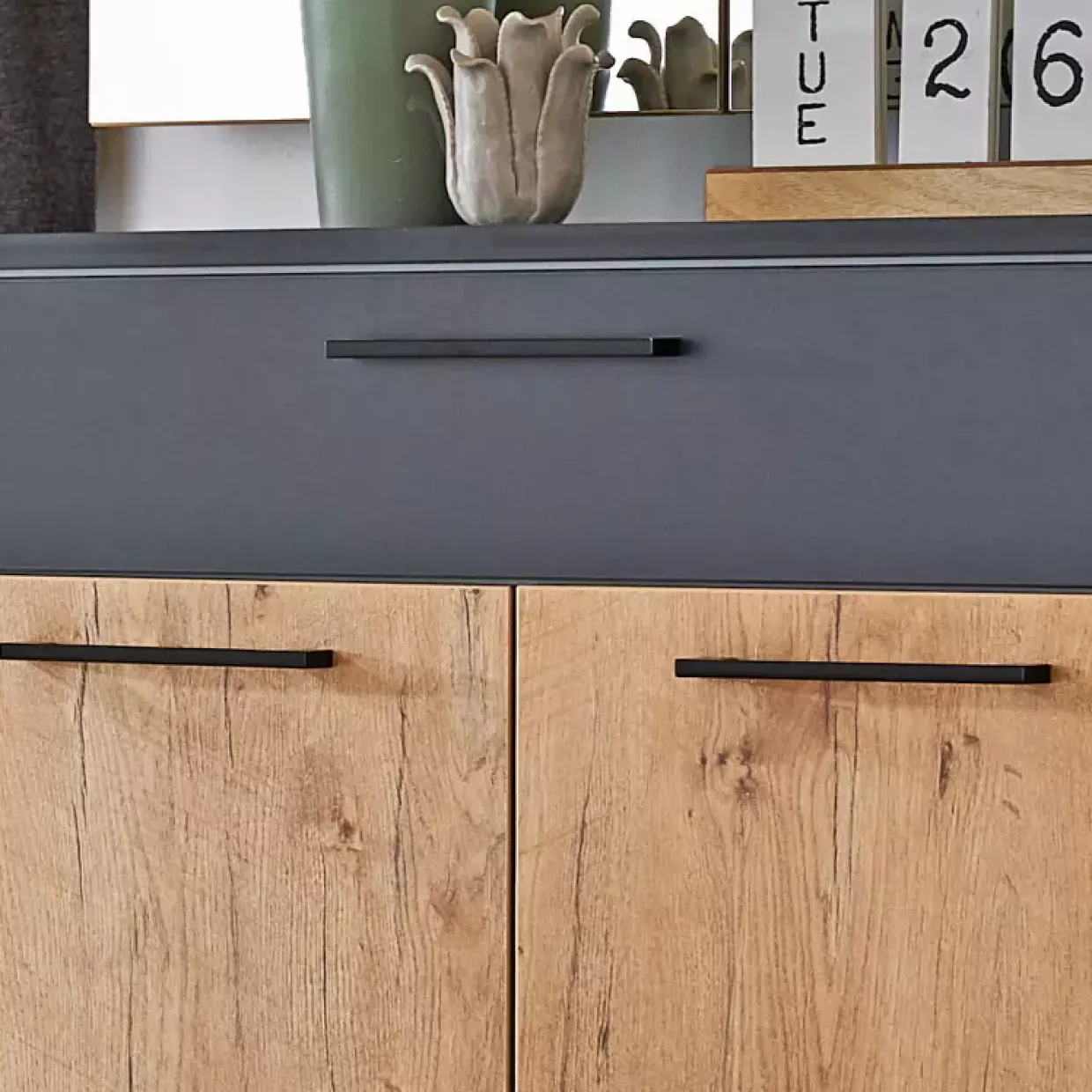 Der schwarze, matte Korpus verleiht der Kommode eine elegante Note und bildet einen harmonischen Kontrast zu den warmen Holztönen der Fronten. Diese Kombination aus Design und Funktionalität macht die Kommode zu einem unverzichtbaren Bestandteil moderner Wohnräume. Die sorgfältige Verarbeitung und die hochwertigen Materialien gewährleisten Langlebigkeit und Stabilität.