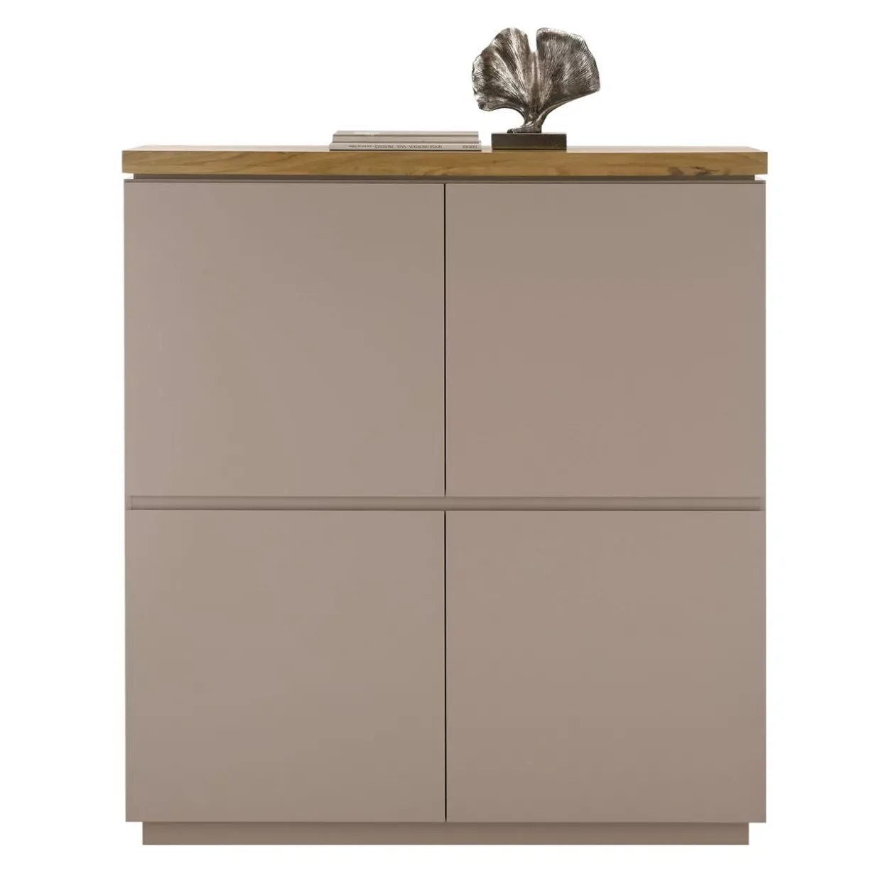 Warmgrau Dekor bringt eine zeitlose Eleganz in jeden Raum. Die Hochkommode, gefertigt aus hochwertigem Holzwerkstoff, vereint modernes Design mit praktischer Funktionalität. Akazienholz sorgt für eine robuste Struktur, die Langlebigkeit garantiert. Die lackierte Oberfläche verleiht dem Möbelstück einen dezenten Glanz und schützt es vor alltäglichen Abnutzungen.Vier Drehtüren mit integrierten Türdämpfern bieten sanftes und leises Schließen, was den täglichen Gebrauch besonders angenehm macht. Mit ihrem modernen Stil fügt sich die Kommode nahtlos in verschiedenste Einrichtungsstile ein und ist somit ein wahrer Allrounder, der in jedem Raum eine gute Figur macht.Ganzjährig ist diese Hochkommode ein praktischer Begleiter, der sowohl in Wohn-, Schlaf- als auch Arbeitsräumen für Ordnung sorgt. Die warme Farbgebung in Kombination mit der natürlichen Holzmaserung der Akazie schafft eine behagliche Atmosphäre und lädt zum Wohlfühlen ein.Ein Highlight dieses Möbelstücks ist die harmonische Verbindung von Funktion und Ästhetik. Während die Kommode reichlich Stauraum für verschiedenste Utensilien bietet, bleibt sie dank ihrer kompakten Maße dennoch platzsparend. Entdecken Sie die Vorzüge dieses stilvollen Möbelstücks und bereichern Sie Ihr Zuhause mit einem Hauch von moderner Eleganz.