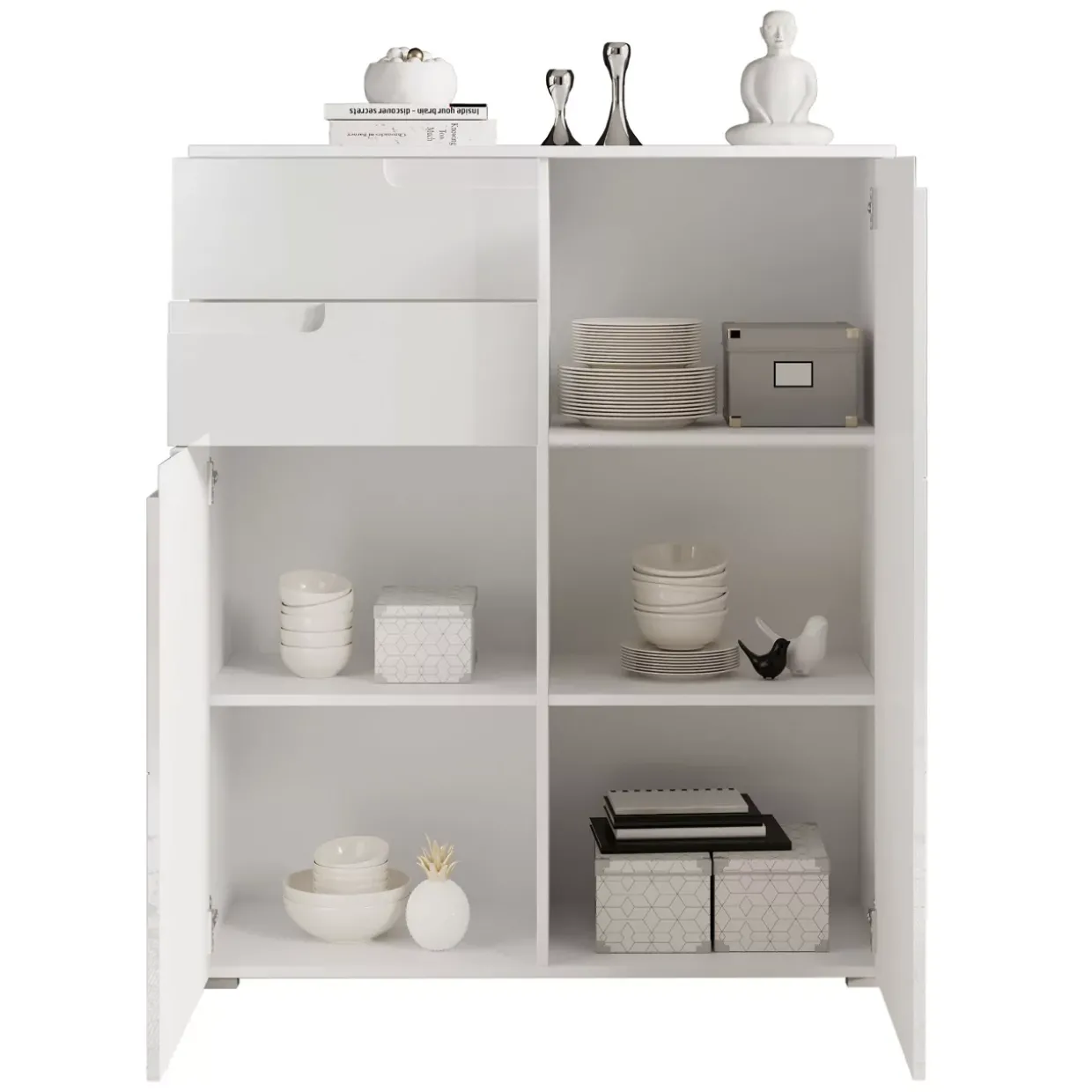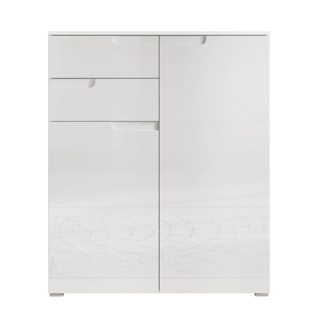 Weiße Hochglanzoberflächen verleihen der modernen Kommode ein elegantes und stilvolles Erscheinungsbild. In jedem Raum wird sie zu einem Blickfang und integriert sich nahtlos in verschiedene Einrichtungsstile. Der Holzwerkstoff, aus dem die Kommode gefertigt ist, überzeugt durch seine robuste Beschaffenheit und Langlebigkeit. Nicht nur funktional, sondern auch ästhetisch ansprechend, bietet die Kommode vielseitige Einsatzmöglichkeiten.