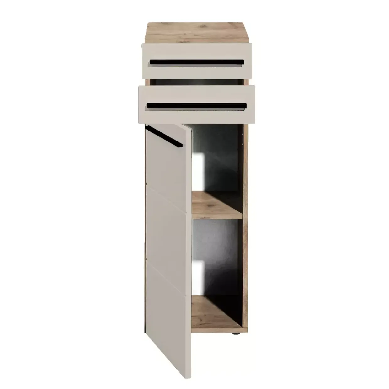 Die Kombination aus Funktionalität und Ästhetik macht diese Kommode zu einem unverzichtbaren Bestandteil moderner Einrichtungen. Die Tür bietet großzügigen Stauraum für größere Gegenstände, während der Schubkasten ideal für kleinere Objekte oder Alltagsgegenstände ist, die schnell zur Hand sein sollen.