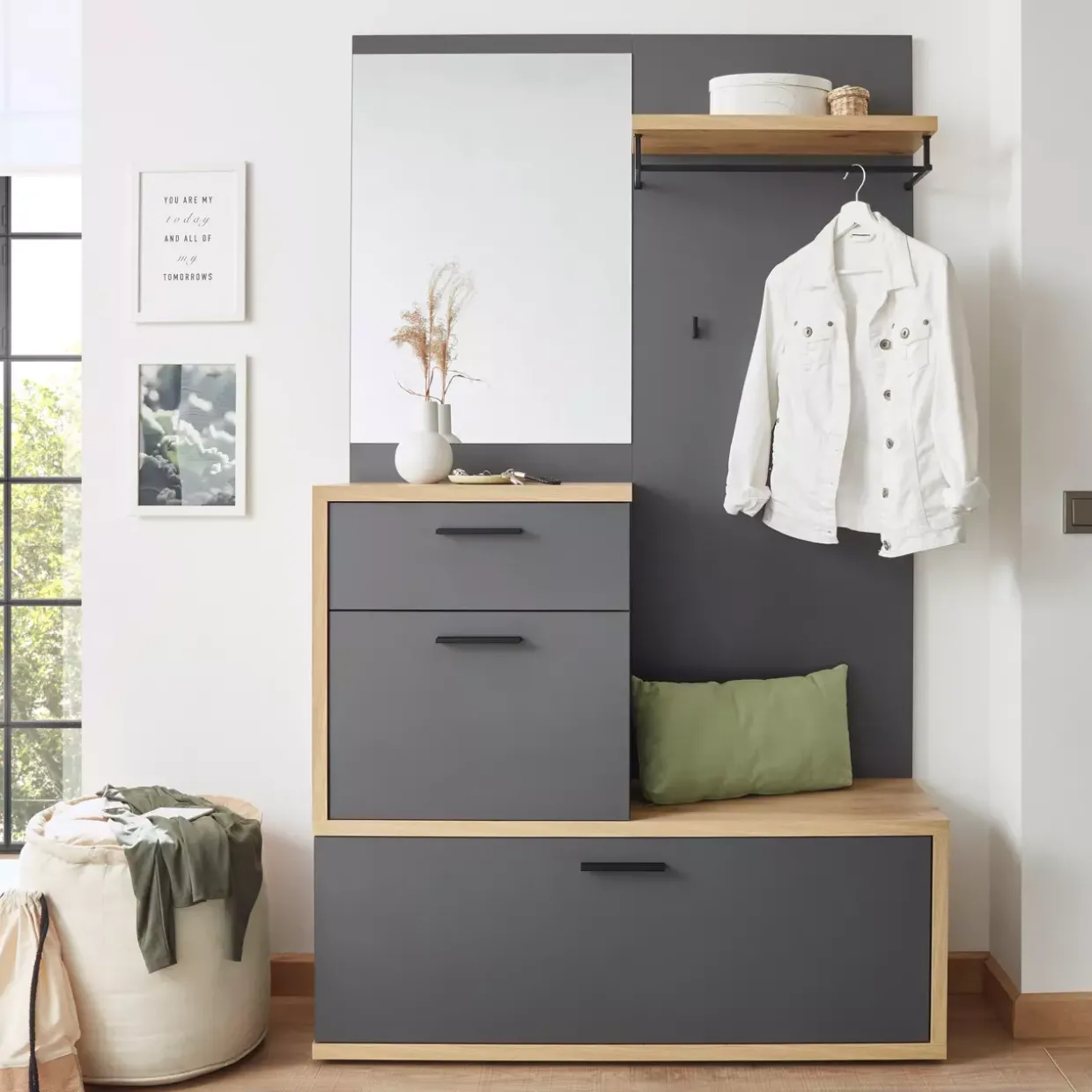 Die harmonische Verbindung von modernem Stil und Funktionalität bietet die Kompaktgarderobe Louis. Die Farbgebung in Artisan Eiche Nachbildung und dunkelgrau verleiht jedem Raum eine elegante und zugleich warme Atmosphäre. Besonders durchdacht ist die Türart: Eine Klappe, die nicht nur praktisch, sondern auch platzsparend ist.