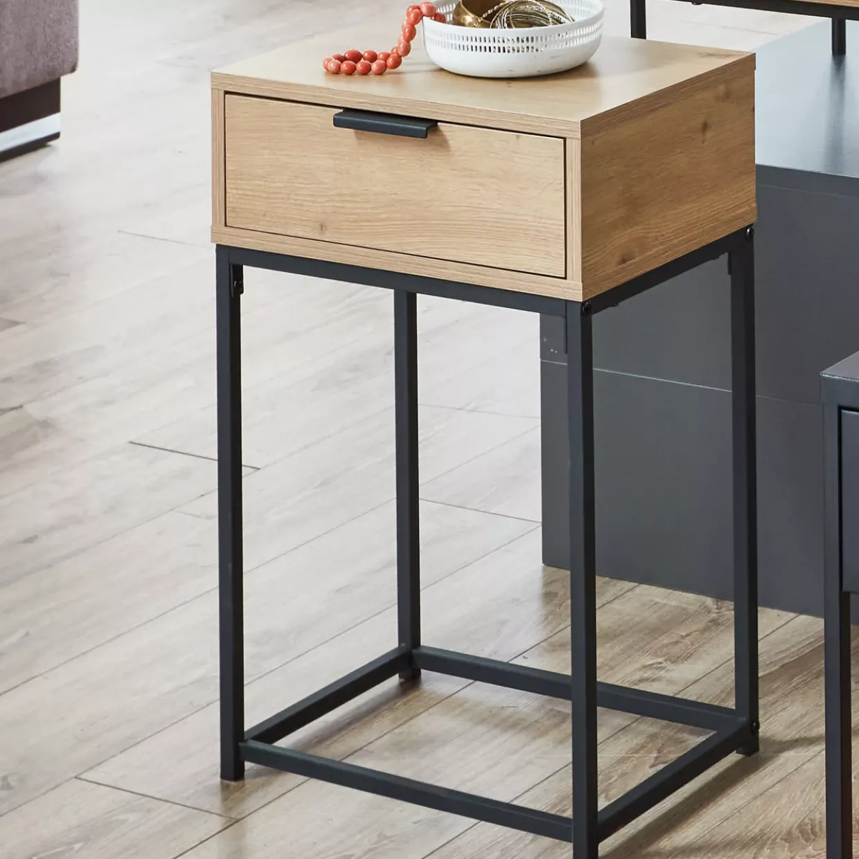 Die Malmö Konsole ist eine elegante und praktische Ergänzung für Ihr Zuhause, die durch ihr modernes Design und hochwertige Materialien besticht. Mit den Maßen 40 x 60 x 40 cm ist sie kompakt und vielseitig einsetzbar, ideal für den Eingangsbereich, das Wohnzimmer oder das Schlafzimmer. Die Konsole verfügt über eine geräumige Schublade, die ausreichend Stauraum für kleinere Gegenstände bietet und so für Ordnung sorgt. Diese Schublade ist aus robustem Holzwerkstoff gefertigt und mit einer Eichenoberfläche versehen, die durch ihre warme Farbgebung und natürliche Maserung überzeugt. Der Rahmen der Konsole besteht aus schwarzem Metall, das dem Möbelstück eine moderne und industrielle Optik verleiht. Die Kombination aus der warmen Eichenoberfläche und dem kühlen, schwarzen Metall schafft einen ansprechenden Kontrast und verleiht der Konsole eine zeitgemäße und elegante Ausstrahlung.