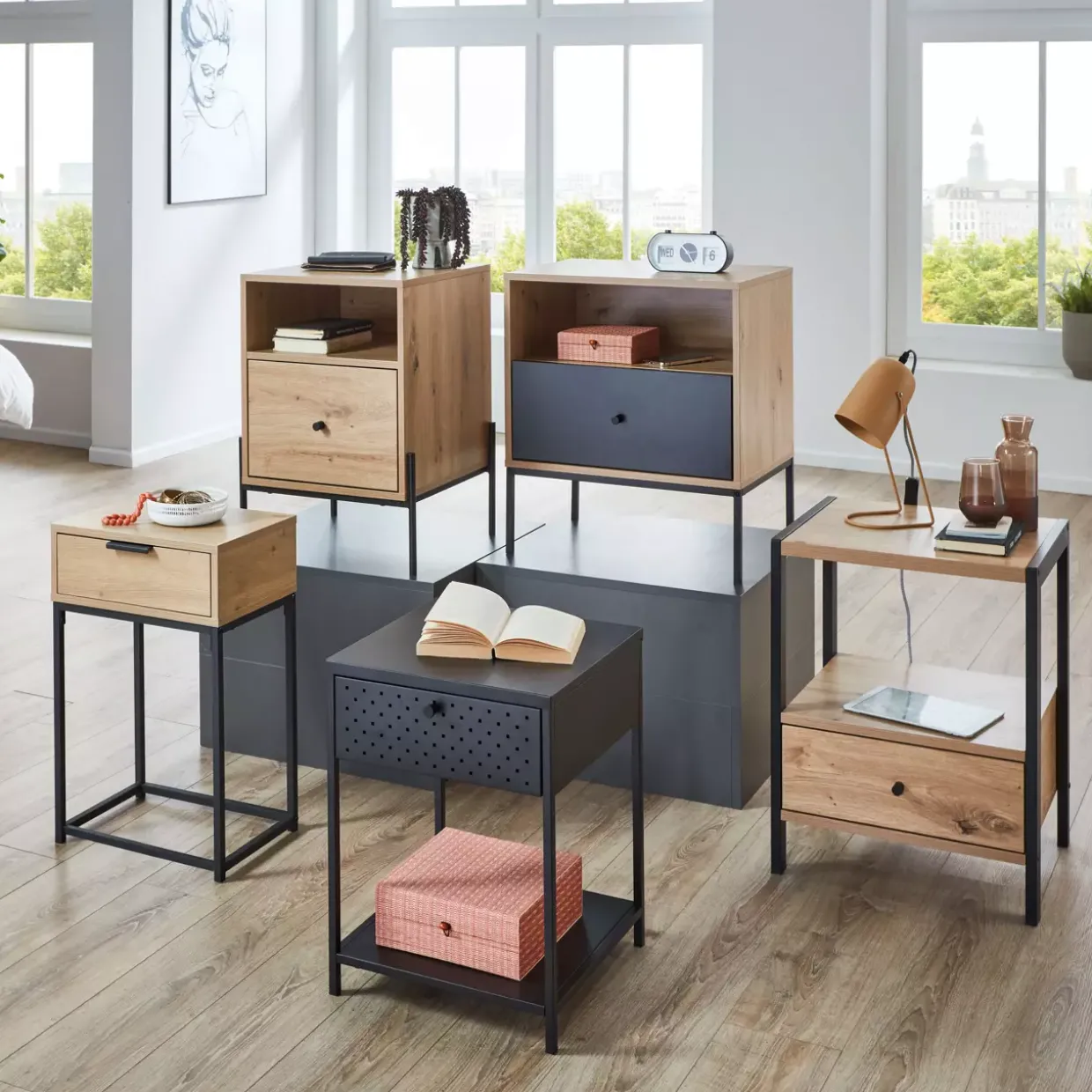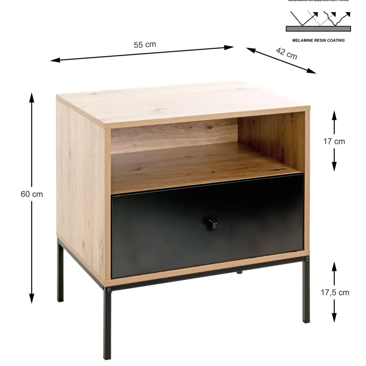 Die Palma Konsole ist eine elegante und funktionale Ergänzung für Ihr Zuhause, die durch ihr modernes Design und hochwertige Materialien überzeugt. Mit den Maßen 55 x 60 x 42 cm bietet sie ausreichend Platz und vielseitige Einsatzmöglichkeiten, sei es im Eingangsbereich, Wohnzimmer oder Schlafzimmer. Diese Konsole verfügt über eine praktische Schublade, die ausreichend Stauraum für kleinere Gegenstände bietet und für Ordnung sorgt. Die Schublade ist aus robustem Holzwerkstoff gefertigt und mit einer Eichenoberfläche versehen, die durch ihre warme Farbgebung und natürliche Maserung besticht. Der Rahmen der Konsole besteht aus schwarzem Metall, das dem Möbelstück eine moderne und industrielle Optik verleiht. Die Kombination aus der warmen Eichenoberfläche und dem kühlen, schwarzen Metall schafft einen attraktiven Kontrast und verleiht der Konsole eine zeitgemäße und elegante Ausstrahlung.