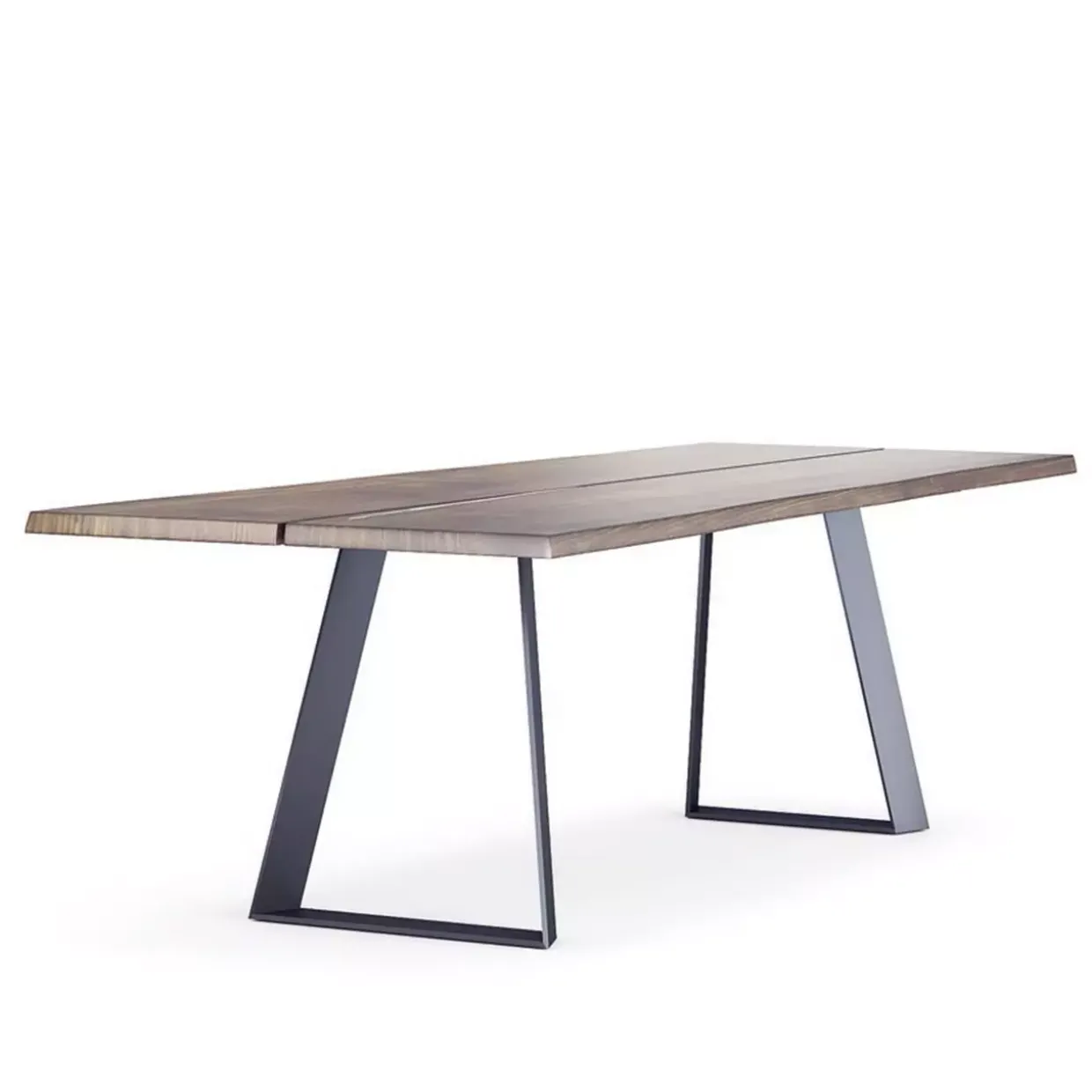 Die einzigartige Kombination aus nachhaltigem Holz und hochwertigem Metall spricht für sich. Das Holz stammt aus verantwortungsvoller Forstwirtschaft, was den Tisch nicht nur zu einem Blickfang, sondern auch zu einer umweltbewussten Wahl macht. Die natürliche Baumkante entlang der Längsseiten und die schrägen Stirnkanten unterstreichen den individuellen Charakter dieses Einrichtungsstücks.