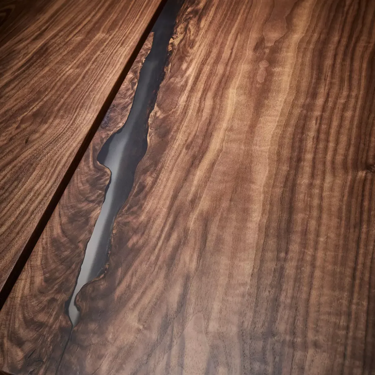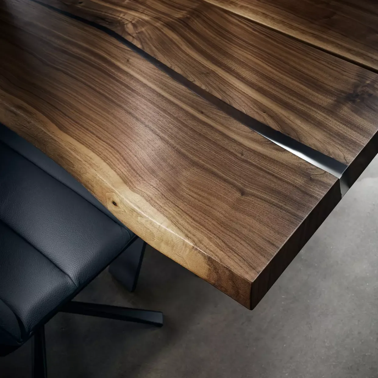 Eine Besonderheit ist die eingravierte Seriennummer, die die Einmaligkeit jedes Tisches bestätigt. Schwarzgraue Elemente setzen elegante Akzente und harmonieren perfekt mit der warmen Holzfarbe. Die versiegelten Risse, Äste, Spalten und Löcher erzählen die Geschichte des Holzes und machen jeden Tisch zu einem Einzelstück.