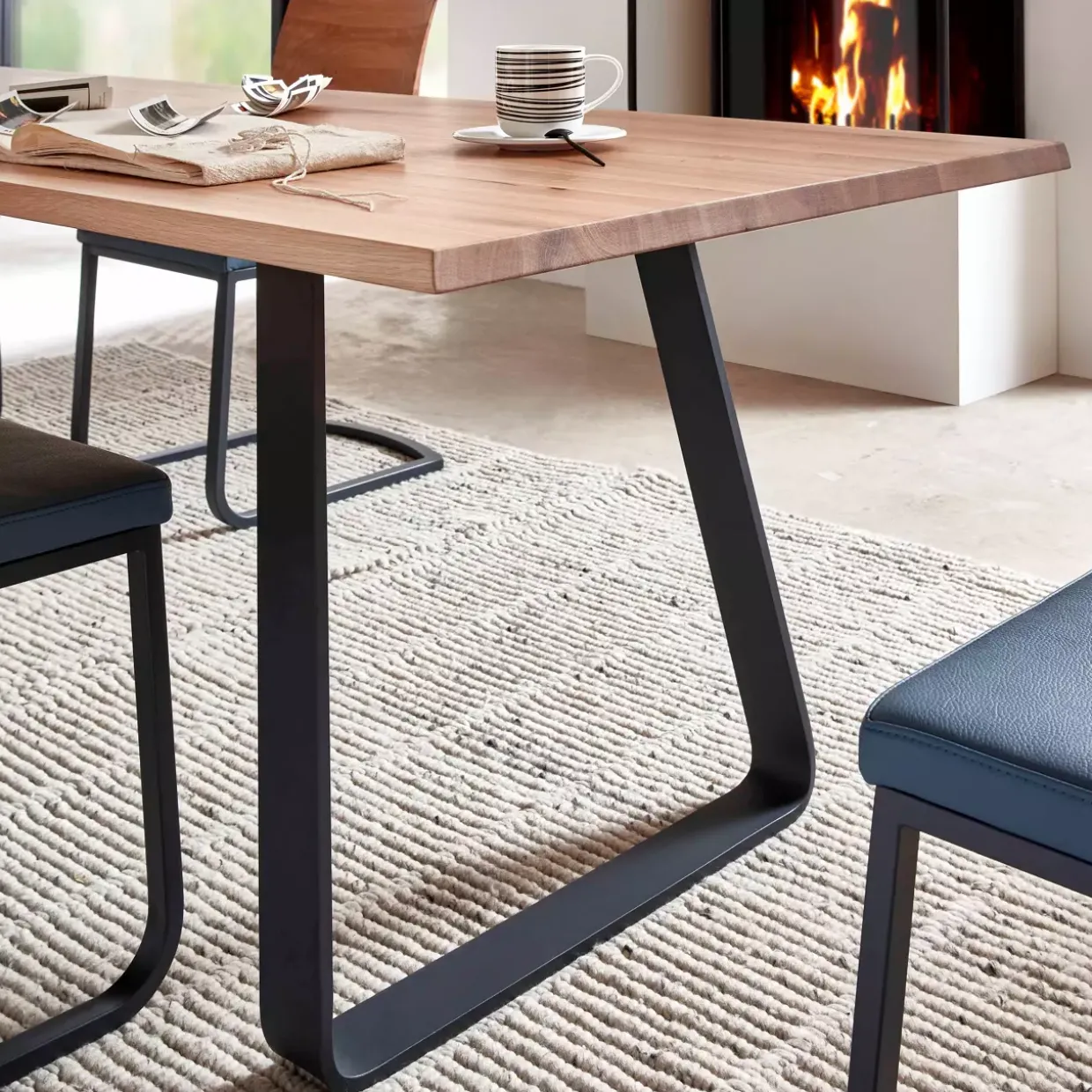 Die Oberfläche mit Hartwachsöl behandelt, präsentiert der Kufenesstisch aus Asteiche eine beeindruckende Kombination aus Funktionalität und Ästhetik. Der Tisch vereint die natürlichen Eigenschaften der Asteiche mit einer robusten Bauweise aus Holz und Metall. Die schrägkantige Tischplatte, deren Risse versiegelt sind, bietet eine perfekte Balance zwischen rustikalem Charme und moderner Eleganz.Ein besonderes Augenmerk verdient die Kufenform der Tischfüße, die nicht nur stabilen Halt gewährleistet, sondern auch einen markanten Akzent in der Raumgestaltung setzt. Die Farbgebung aus schwarzgrauem Metall und rustikaler Asteiche fügt sich harmonisch in verschiedene Einrichtungsstile ein, sei es ein traditionelles Ambiente oder ein zeitgemäßes Umfeld.Die geölte Oberfläche des Tisches sorgt für eine angenehme Haptik und hebt die natürliche Maserung des Holzes hervor, während sie gleichzeitig Schutz und Langlebigkeit bietet. Dieser Esstisch lädt zu geselligen Runden und gemütlichen Stunden ein und wird sicherlich zum Mittelpunkt Ihres Wohnbereichs. Ob bei einem gemütlichen Abendessen oder beim geselligen Beisammensein – diese Tischkreation steht für Qualität und zeitlose Eleganz. Lassen Sie sich von der Verbindung aus traditionellem Handwerk und modernem Design inspirieren.