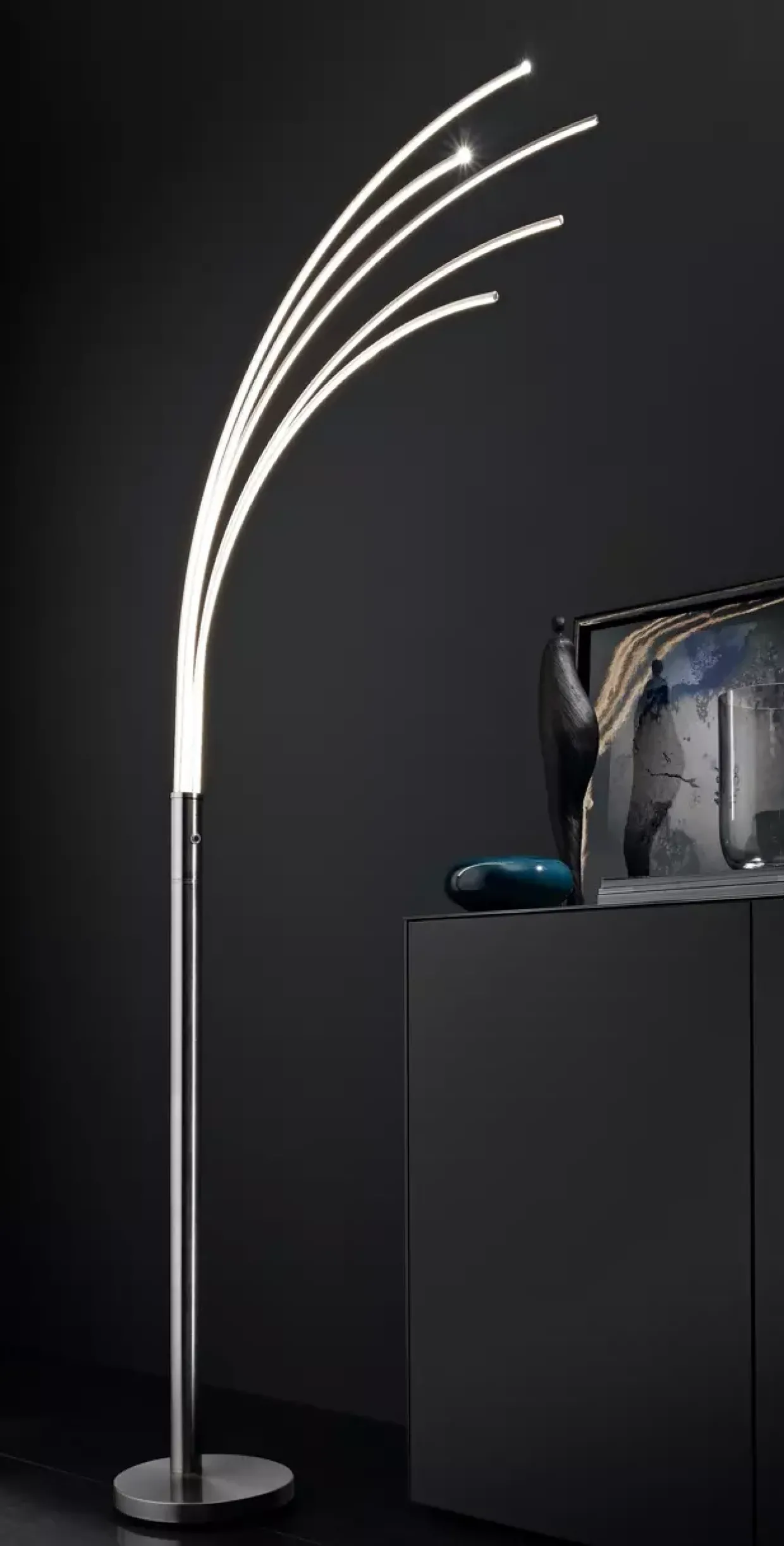 Eclipse, ein Modell, das Ihren Raum in ein stilvolles Ambiente taucht. Diese LED-Bogenstehleuchte fasziniert durch ihr modernes Design und die elegante silberne Nickeloberfläche. Mit 400 Lumen sorgt sie für eine angenehme Beleuchtung, die durch die warmweiße Lichtfarbe Gemütlichkeit und Entspannung in jedes Zimmer bringt.