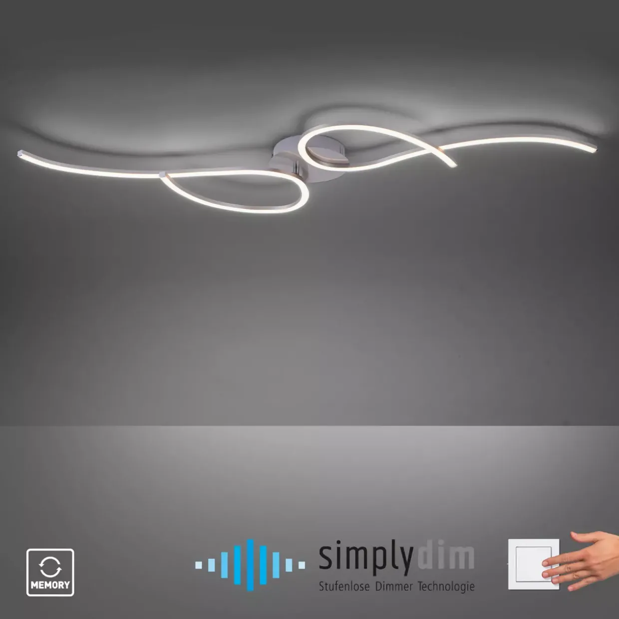 Mit einem eleganten stahlfarbenen Design fügt sich diese moderne Deckenleuchte mühelos in jedes zeitgemäße Interieur ein. Ihre Vielseitigkeit wird durch die Simply-Dym-Funktion unterstrichen, die es ermöglicht, die Helligkeit stufenlos über den Wandschalter zu regulieren. Eine beeindruckende Lichtleistung von 2000 bis 3800 Lumen sorgt für optimale Helligkeit, während das warmweiße Licht mit einer Farbtemperatur von 3000 Kelvin eine angenehme Atmosphäre schafft.Zwei Leuchten aus hochwertigem Kunststoff und robustem Metall, darunter Aluminium und Stahl, garantieren Langlebigkeit und Stil. Die integrierten LED-Leuchtmittel bieten nicht nur eine hohe Energieeffizienz, sondern sind auch bereits im Lieferumfang enthalten. Ein besonderes Highlight ist der drehbare Arm, der eine flexible Ausrichtung des Lichts ermöglicht.Dank der Memory-Funktion erinnert sich die Deckenleuchte an die zuletzt gewählte Einstellung, wodurch die Bedienung äußerst komfortabel wird. Die Kombination aus Funktionalität und modernem Design macht diese Deckenleuchte zu einer idealen Wahl für Wohnräume, die sowohl stilvoll als auch funktional beleuchtet werden sollen. Diese Deckenleuchte vereint technologische Raffinesse mit einem ansprechenden Erscheinungsbild und bietet Ihnen ein Beleuchtungserlebnis, das keine Wünsche offenlässt.